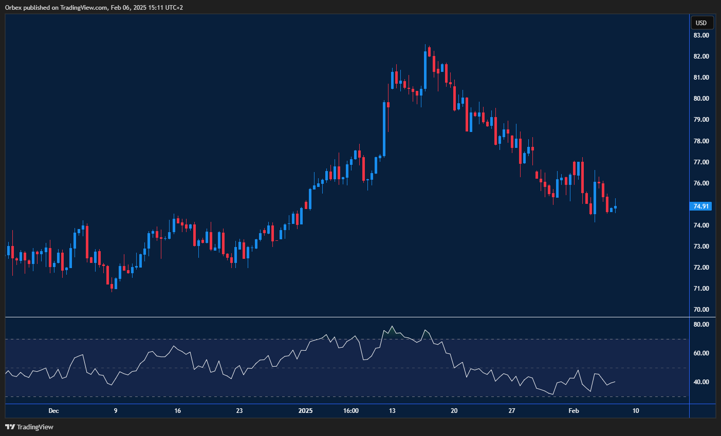تراجع النفط الخام بنسبة 2% أخرى، وسط تصاعد المخاوف من تأثير الرسوم الجمركية الأمريكية على الصين. أي تصعيد من جانب بكين قد يعزز مخاوف نشوب حرب تجارية، مما قد يضغط على أسعار النفط بشكل أكبر. بعد التراجع الحاد من القمة المسجلة في يناير فوق 82.00 دولارًا، يحتاج أي ارتداد صعودي إلى اختراق مستوى 77.00 أولًا. أما في حال استمرار الضغوط البيعية، فإن كسر 74.00 قد يفتح الباب أمام تصحيح أعمق للأسعار.