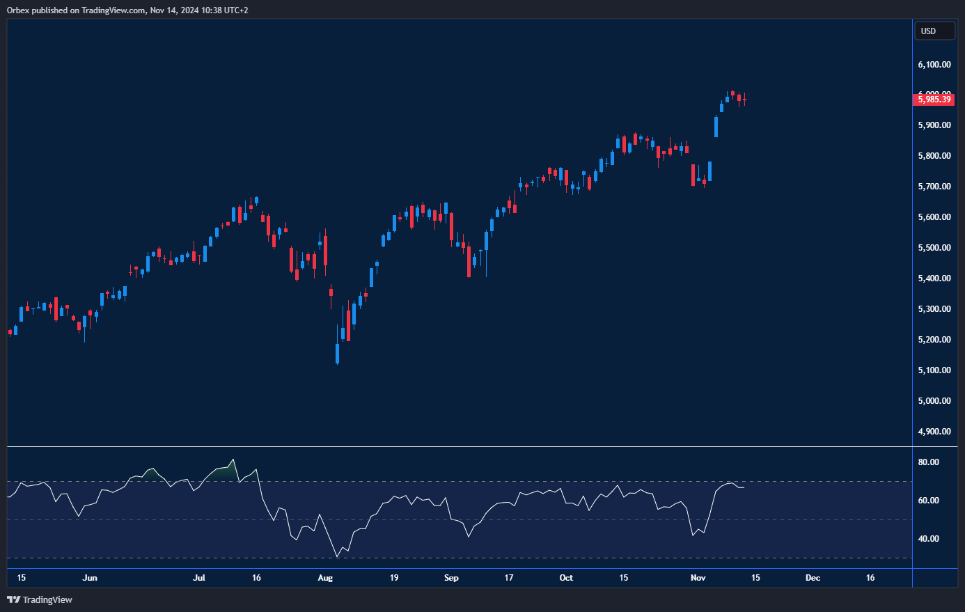 انخفض مؤشر ستاندرد آند بورز 500 لأول مرة منذ الانتخابات الرئاسية حيث قفزت عوائد السندات بعد أن فشلت معدلات التضخم في الوصول إلى الهدف الذي أقره الفيدرالي الأمريكي والذي يبلغ 2%. إذ شهدت معظم القطاعات الرئيسية في المؤشر انخفاضًا مع ارتفاع العوائد. ومع تحقيق المؤشر لأرقام قياسية متتالية، يتساءل المتداولون عن المدة التي يمكن أن يستمر فيها هذا الأداء. خصوصًا مع وجود احتمالية تصحيح في الأسعار قريبًا. يحتفظ المؤشر بمستوى فوق 5.800 نقطة، في حين يُعتبر مستوى 6000 نقطة هو المقاومة التي يجب اختراقها.
