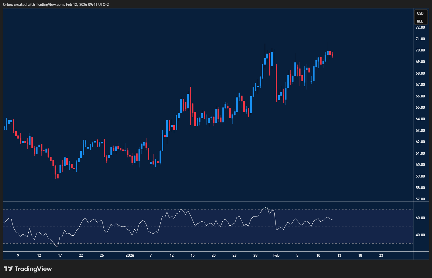 اندفعت أسعار الخام نحو أعلى مستوياتها منذ عدة أشهر، مع بقاء أنظار المستثمرين شاخصة نحو تصاعد حدة التوترات الجيوسياسية بين الولايات المتحدة وإيران. ولم يفلح التراكم الملحوظ في المخزونات في تهدئة المخاوف، إذ يظل الطلب المرتبط بموسم البرد عاملاً مؤثراً في تحركات الأسعار الحالية. ومع سعي واشنطن لتعزيز حضورها في الشرق الأوسط، قد تكون هذه هي اللحظة التي تندفع فيها الأسعار نحو مستويات غير مسبوقة. ويبرز حالياً مستوى 75.00 كهدف فوري تترقبه الأسواق، بينما يظل مستوى 68.00 هو الدعم الجوهري الذي تجب حمايته لمنع الانهيار.
