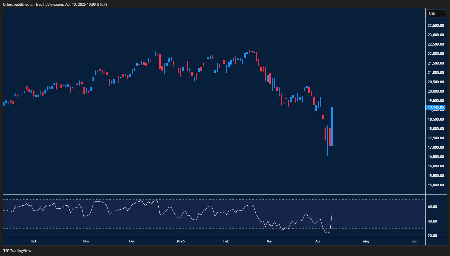 شهد مؤشر ناسداك ومعظم المؤشرات السوقية الأخرى انتعاشًا قويًا بعد قرار ترامب بتعليق الجزء الأكبر من التعريفات المتبادلة. يتجه المؤشر حاليًا لاختبار مستويات قياسية جديدة، متجاوزًا توقعات حدوث تصحيح عميق. لقي قرار التهدئة لمدة 90 يوماً، إلى جانب تخفيض التعريفات إلى 10% فقط، ترحيباً واسعاً في وول ستريت، مما ينبئ بفترة من الهدوء النسبي في الأسواق الأوروبية. من الناحية الفنية، يتجه المؤشر حاليًا لاختبار مستوى 19400 كمقاومة محورية، بينما يحافظ مستوى 18600 على أهميته كدعم رئيسي.