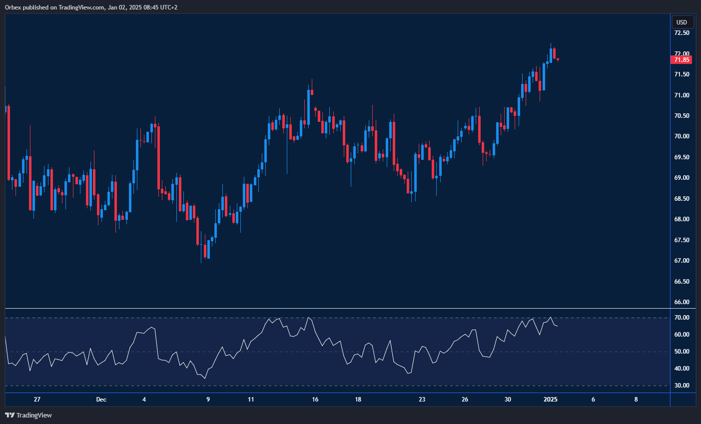 نجح خام غرب تكساس الوسيط في تخطي القمة السابقة عند 71.00، مما أضفى عليه بعض الزخم مع بداية العام الجديد. ومع ذلك، واجه الارتفاع الأخير بعض المقاومة، مما يشير إلى استمرار الحذر في السوق، حيث يبدو أن البائعين مستعدون لتعزيز مراكزهم. يُعتبر الحفاظ على مستوى 72.50 أمرًا حيويًا لاستمرار نمط القمم المرتفعة الأخيرة في حال استمر المشترون في العودة. من ناحية أخرى، فإن الانخفاض دون مستوى 70.50 قد يلغي التعافي الحالي.