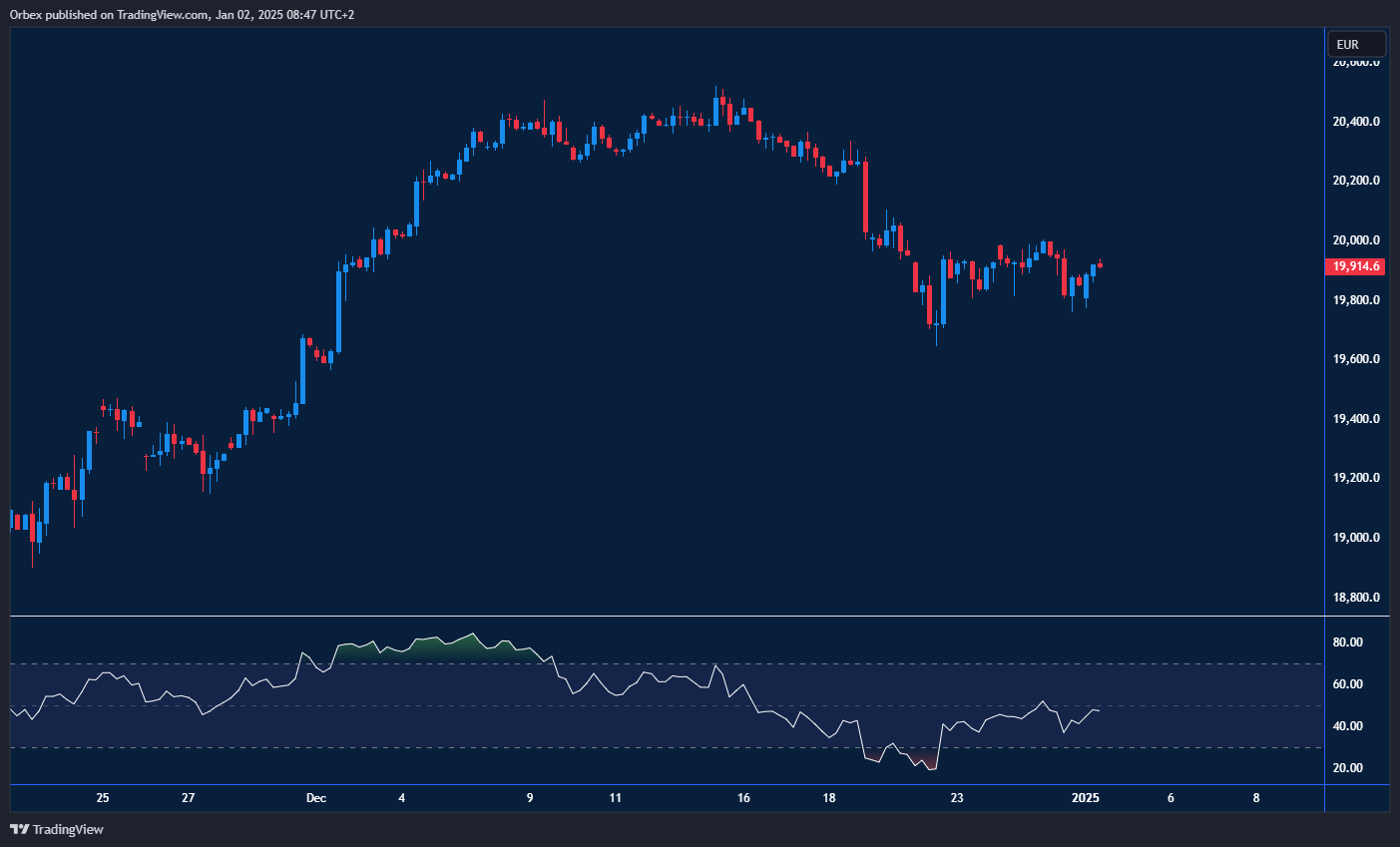 يتطلع مؤشر داكس للارتفاع مدفوعًا بزيادة شهية المستثمرين نحو الأسهم بشكل عام. يهدف المؤشر لتجاوز أعلى مستوى قياسي له فوق المستوى 20500، حيث يسعى المشترون لتعزيز الاتجاه الصاعد بعد موجة البيع الأخيرة. ومع ذلك، نظرًا لارتداد مؤشر القوة النسبية من منطقة ذروة الشراء، يُتوقع حدوث تراجع بسيط في الأسعار لإفساح المجال للارتفاع المحتمل لاحقًا. يعتبر مستوى 19750 دعمًا جديدًا، في حين أن المستوى النفسي 20000، والذي تحوّل من مقاومة إلى دعم، قد يشهد إقبال أتباع الاتجاه على المدى القصير، مما يدفع المؤشر لمزيد من الارتفاع.