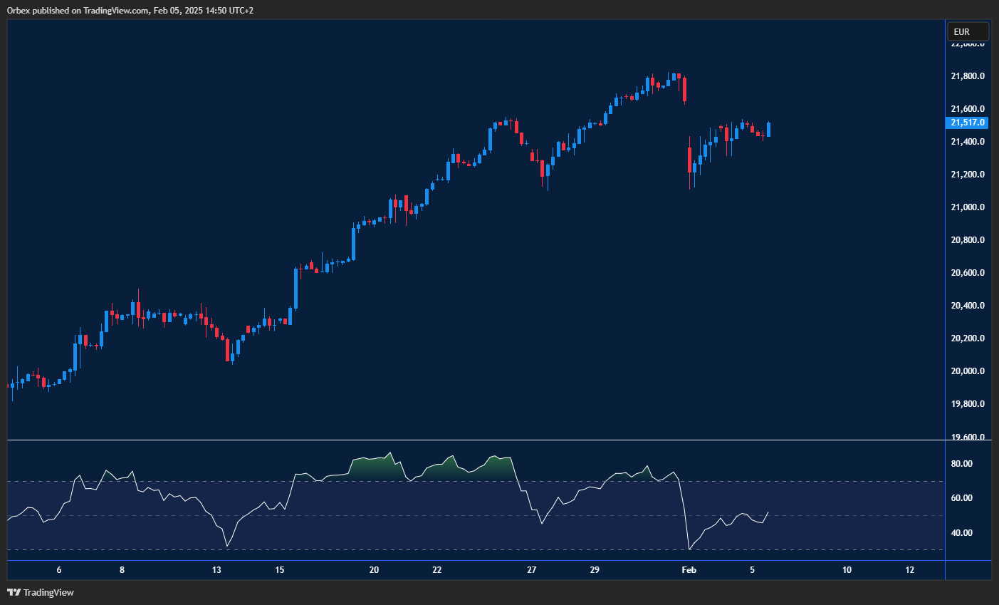شهد مؤشر داكس انتعاشًا قويًا في الجلسات الأخيرة، مع عودة الأسواق الأوروبية إلى الأداء الإيجابي. وعلى الرغم من تسجيل فجوة سعرية هابطة بسبب التباين السلبي في مؤشر القوة النسبية، إلا أن الأسعار سرعان ما تحركت لتغطية الفجوة واستهداف قمم جديدة. إذا ظهرت إشارات ضعف، فقد يتحول مستوى 21000 إلى دعم رئيسي في حال قرر السوق التقاط أنفاسه. أما في حال كسر هذا المستوى، فقد يكون ذلك إشارة إلى بدء موجة بيع حادة.