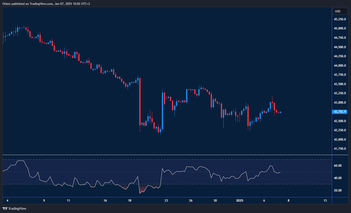 يشهد مؤشر داو جونز 30 ارتفاعًا طفيفًا بعد أن ابتعد عن مستوى القاع المزدوج الأخير. يستهدف المؤشر الوصول إلى مستوى 43500، إلا أن الحاجز النفسي عند 43000 يمثل تحديًا كبيرًا. يظهر الرسم البياني للساعة وجود تباين سلبي في مؤشر القوة النسبية، مما يدل على ضعف زخم الارتفاع، ولكن الانخفاض دون مستوى 42500 سيكون كافيًا لتأكيد ضعف الاتجاه، وقد يؤدي إلى تشكيل قاع ثلاثي عند 42200.