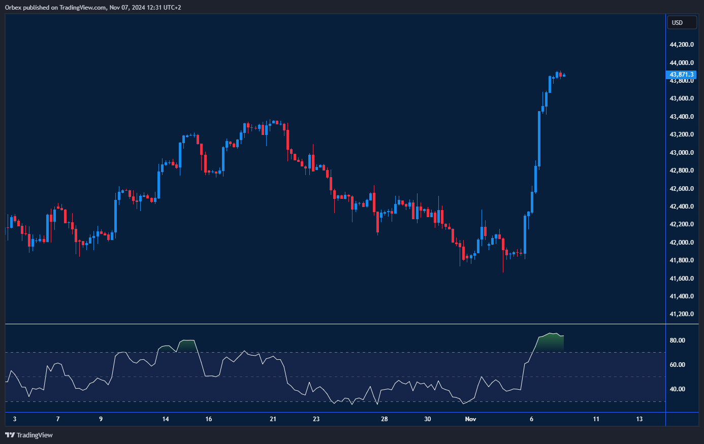 شهد مؤشر داو جونز ارتفاعاً حاداً تجاوز 1000 نقطة، مدفوعاً بالتأثيرات المستمرة للانتخابات الرئاسية الأمريكية لعام 2024. وواصل المؤشر صعوده بعدما تجاوزه المستوى القياسي السابق، حيث وجه المتداولون أنظارهم نحو الهدف التالي عند المستوى 44000. وبعد أن قلص تجاوز مستوى المقاومة الأول عند 43200 من ضغوط البيع، تتمثل المرحلة التالية في التأكد من وجود طلبات متابعة كافية لدعم مواصلة المؤشر ارتفاعه. وإذا حدث تصحيح بسبب بلوغ مؤشر القوة النسبية منطقة ذروة الشراء، فإن المستوى 43400 يمثل الدعم الأقرب.