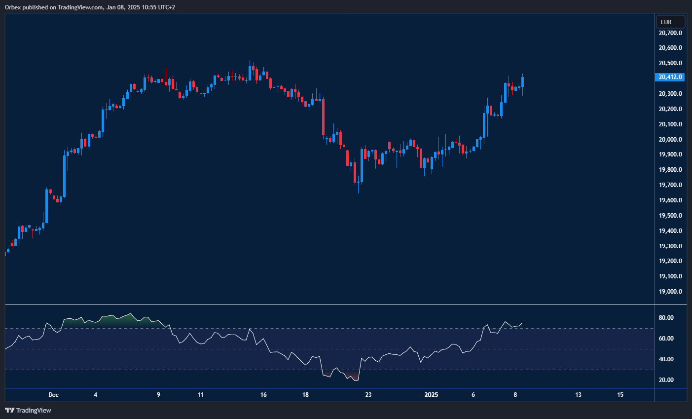 تعافى مؤشر داكس ليصل إلى مستوى مرتفع جديد، في ظل ترقب المستثمرين لسياسة البنك المركزي الأوروبي للعام الجديد. وقد أدى اختراق مستوى 20000 إلى فتح المجال للوصول إلى مستوى قياسي جديد عند المستوى النفسي 21000. المعنويات في السوق إيجابية للغاية، لكن الارتفاع السريع دفع بمؤشر القوة النسبية اليومي إلى منطقة ذروة الشراء. مما يشير إلى احتمال حدوث تصحيح لإتاحة الفرصة للمشترين لاستعادة نشاطهم. ويعتبر مستوى 20200 هو الدعم المباشر الذي يحتاج المؤشر للحفاظ عليه للحفاظ على مكاسبه الحالية.