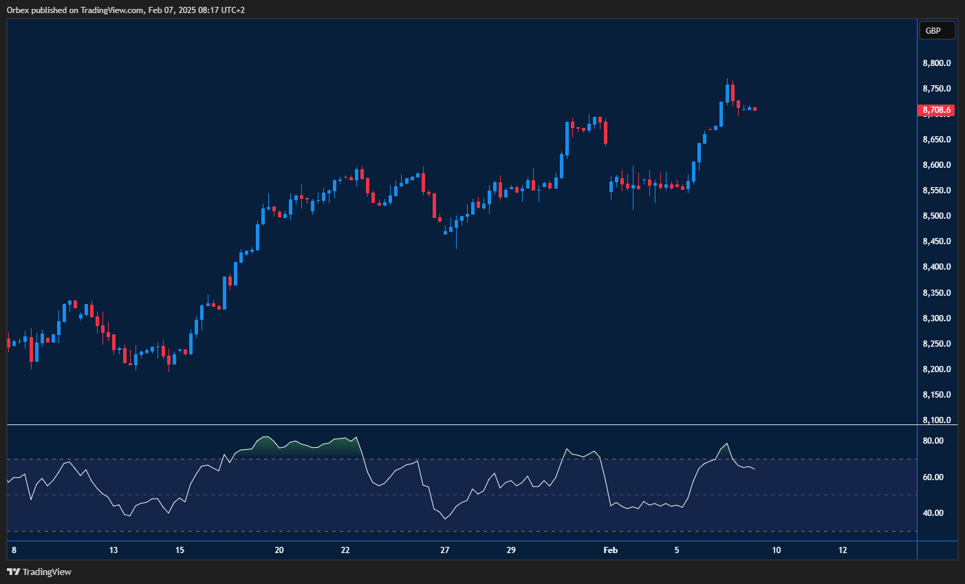 استمر مؤشر فوتسي 100 في تحقيق مكاسب جديدة بعد قرار بنك إنجلترا بشأن أسعار الفائدة، مما عزز الثقة في الأسواق. لا يزال الاتجاه الصعودي قويًا بعد اختراق المقاومة السابقة عند 8600، والتي تحولت الآن إلى مستوى دعم رئيسي. يتطلع المشترون إلى الحفاظ على هذه المستويات المرتفعة واختبار 8700 كهدف صعودي جديد. ومع ذلك، فإن دخول مؤشر القوة النسبية إلى منطقة التشبع الشرائي قد يشير إلى احتمالية حدوث تصحيح طفيف في الأسعار. في حال استمر التراجع، فقد نشهد عمليات جني أرباح أوسع تدفع المؤشر نحو 8550، وهو القاع السابق.