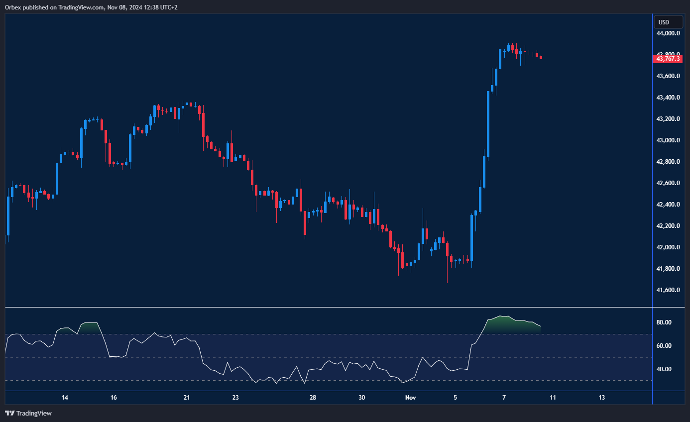 سجل مؤشر داو جونز رقمًا قياسيًا جديدًا بفضل تجدد التفاؤل في الأسواق. حيث يتوقع المستثمرون أن يتم تنفيذ التخفيضات الضريبية في وقت أقرب مما كان متوقعًا في ظل إدارة ترامب. من المتوقع أن يدخل المؤشر في مرحلة من التماسك بعد توقف الارتفاع عند مستوى 43800. تمثل القمة السابقة عند 43200 مستوى مهمًا، حيث يُتوقع أن تستمر عمليات الشراء عند هذا المستوى، مما قد يعزز الزخم ويدفع المؤشر نحو مستوى 44000. ومع ذلك، فإن انخفاض السعر دون مستوى 43400 قد يؤثر سلبًا على التفاؤل في السوق. مما قد يؤدي إلى تراجع داو جونز 30 وبدء مرحلة تصحيح.
