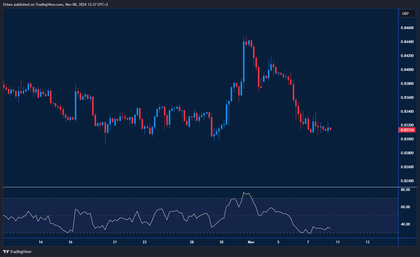 اكتسب الجنيه الاسترليني مزيدًا من الزخم أمام اليورو، وتمكن من استعادة جميع الخسائر التي تكبدها في بداية الشهر. وقد أدى الانخفاض الأخير دون مستوى الدعم الحاسم 0.8350 إلى دفع المزيد من المشترين لتغطية مراكزهم. هذا الأمر يشير إلى احتمال استمرار الاتجاه الهابط. من المتوقع أن يشهد الزوج استقرارًا نسبيًا عند القاع الأخير 0.8300، حيث يُعتبر هذا المستوى آخر خط دفاع للمشترين قبل استئناف الهبوط. في حال كسره، قد يواجه السعر مزيدًا من التراجع نحو مستوى 0.8240. ومع بقاء مؤشر القوة النسبية في منطقة ذروة البيع، قد يشهد سعر الصرف ارتدادًا نحو الأعلى، حيث يُعتبر المستوى 0.8330 أول مقاومة يتم اختبارها.