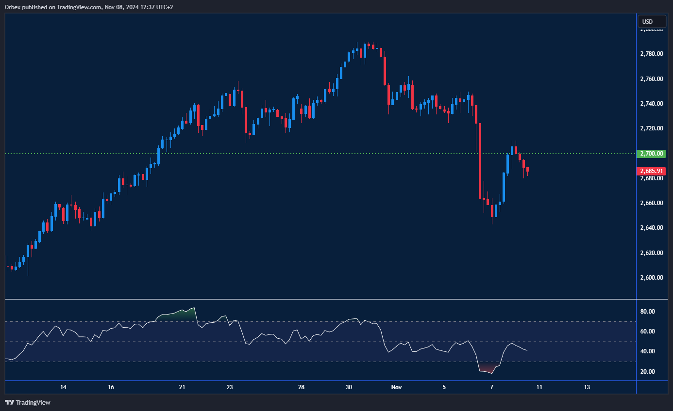 واجه الذهب مستوى مقاومة حال دون استعادة المستوى 2700. لكنه تمكن من تعويض معظم الخسائر الناتجة عن عمليات التصفية الأخيرة، في ظل استمرار تأثير نتائج الانتخابات الرئاسية الأمريكية. إذا تمكن الذهب من اختراق مستوى 2715 وتجاوزه، فقد يُجبر البائعون على تغيير استراتيجيتهم نحو الشراء، مما يشير إلى إمكانية حدوث تعافٍ مستدام نحو مستوى 2740. وقبل الوصول إلى ذلك، قد يشهد الذهب بعض التراجع، حيث يمثل مستوى 2640 عند القاع الأخير دعماً مهماً.