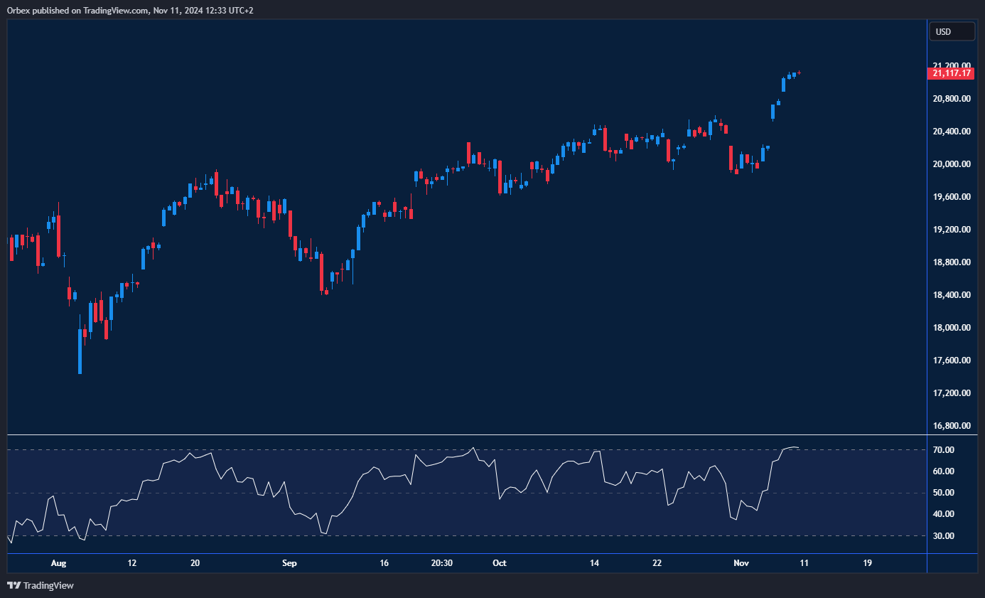 واصل مؤشر ناسداك صعوده مدفوعًا بتأثيرات فوز ترامب وقرارات خفض الفائدة من الاحتياطي الفيدرالي. يسعى المؤشر للبقاء فوق مستوى 21000 بعد ارتفاعه بأكثر من ألف نقطة خلال جلسات قليلة. ويعتبر مستوى 19900 عند قاعدة الحركة الصاعدة الأخيرة مستوى مهم، وقد يجذب الارتداد من هذا المستوى المزيد من الزخم الشرائي ويعزز فرص الوصول إلى مستوى 21500. أما التراجع دون 20400 فقد يقلل من التفاؤل ويدفع المؤشر نحو أدنى مستوياته اليومية عند 20000.