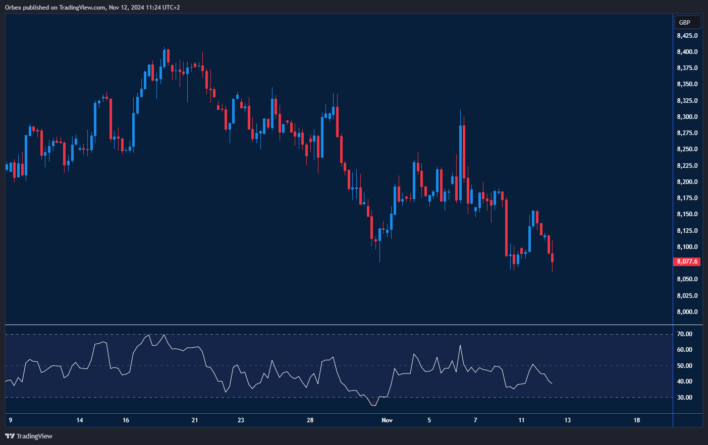 انخفض مؤشر فوتسي البريطاني بشكل حاد بعد ارتفاع معدل البطالة في المملكة المتحدة بأكثر من المتوقع. تسبب الهبوط القوي دون مستوى 8200 في دفع المشترين الأخيرين إلى إغلاق مراكزهم، مما أثر سلبًا على الزخم الصعودي قصير الأجل. ومع دخول مؤشر القوة النسبية (RSI) منطقة التشبع البيعي، يمثل مستوى 8050 الدعم التالي الذي قد يستقطب اهتمام المشترين مجددًا. من ناحية أخرى، فإن الارتفاع فوق 8175 قد يعكس الاتجاه ويمنع المؤشر من الدخول في اتجاه هبوطي.