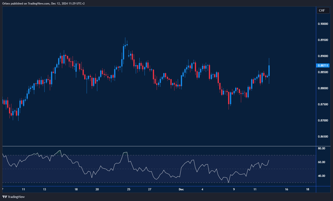 تراجع الدولار الأمريكي نتيجة ارتفاع طفيف في بيانات التضخم، مما قد يزيد الضغوط على الاحتياطي الفيدرالي خلال اجتماعه المقبل. وقد ساهم تجاوز مستوى المقاومة اليومي عند 0.8850 في استمرار زخم الارتفاع، مما وضع البائعين تحت ضغط جديد. دفع التماسك المؤقت الأسعار نحو مستويات 0.8900 و0.8950 عند القمة السابقة، وهو المستوى الذي سيتم اختباره لمعرفة ما إذا كان المشترون سيستمرون في السيطرة. من جهة أخرى، يمثل مستوى الارتداد الأخير عند 0.8800 دعمًا قويًا يُتوقع أن يستند إليه الاتجاه الحالي.