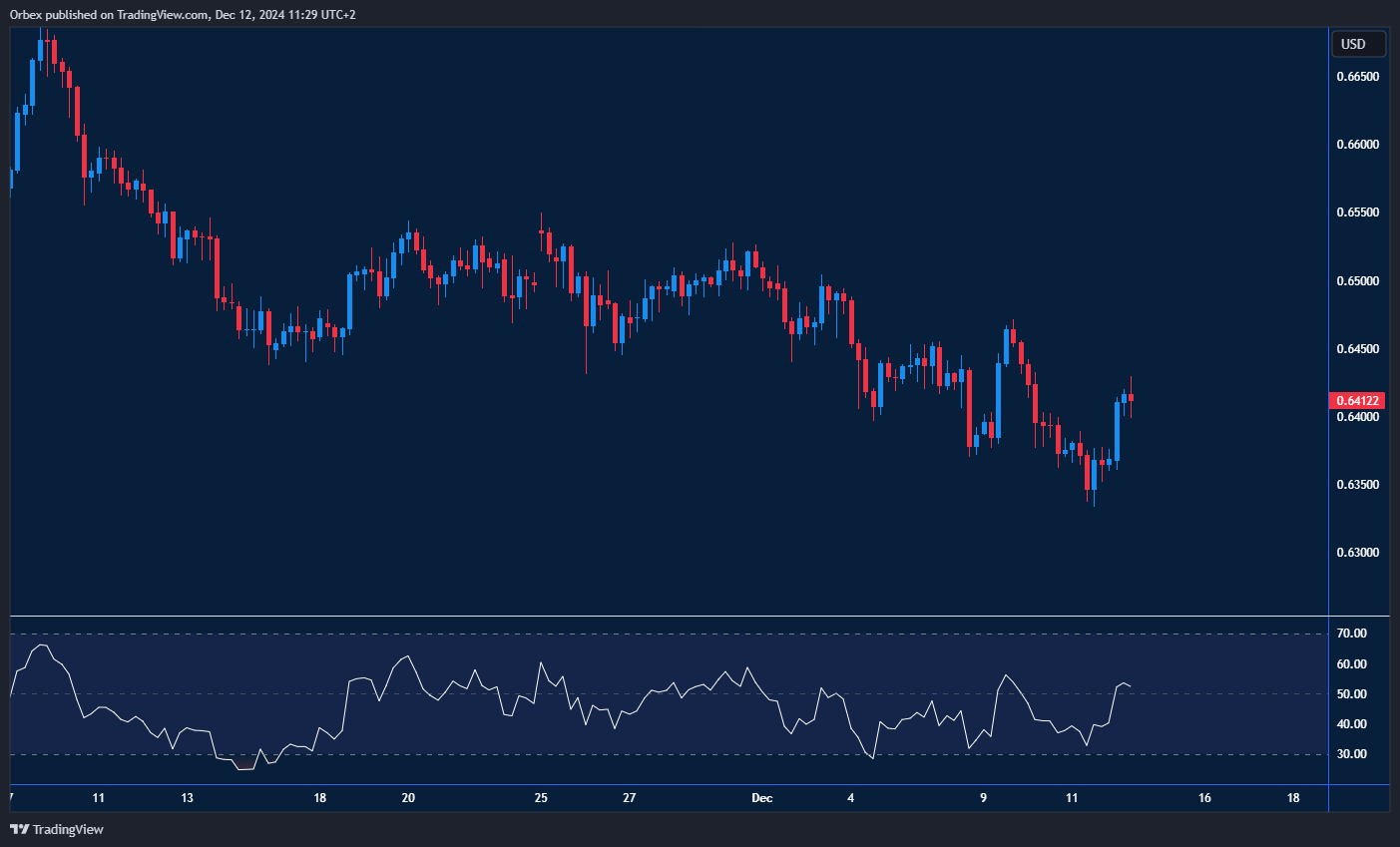 ارتفع الدولار الأسترالي بعد تأثر نظيره الأمريكي بارتفاع التضخم بشكل ملحوظ. على الرسم البياني، يستمر الزوج في تعويض خسائره التي تكبدها نتيجة عمليات البيع في نوفمبر. يشير تسجيل قمة أعلى من مستوى 0.6400 إلى وجود ضغط شراء قوي، على الرغم من وجود مقاومة في منطقة العرض. قد يكون الارتفاع التالي عند المستوى 0.6460 هو آخر معقل للبائعين، وقد يؤدي اختراقه الطريق إلى مزيد من الارتفاع نحو 0.6500. في حال الهبوط، يعد مستوى 0.6330 دعماً مباشرًا وحاجزاً رئيسياً للحفاظ على التحيز الإيجابي.