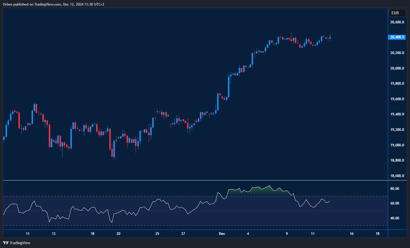 لا يزال مؤشر داكس 40 متماسكًا بعد تحقيقه قمة جديدة. أعاد الارتفاع الأخير في السوق المؤشر إلى منطقة القمة الثلاثية بالقرب من مستوى 20500. اختراق هذه المنطقة قد يمهد الطريق لتحقيق قمة قياسية جديدة، مما يعزز التوقعات باستمرار الاتجاه الصاعد على المدى المتوسط. ولكن على المدى القريب، قد يدفع تكرار توغل مؤشر القوة النسبية في منطقة ذروة الشراء المشترين لجني بعض الأرباح. وفي حال حدوث تصحيح، سيكون مستوى 20200 هو الدعم المباشر.