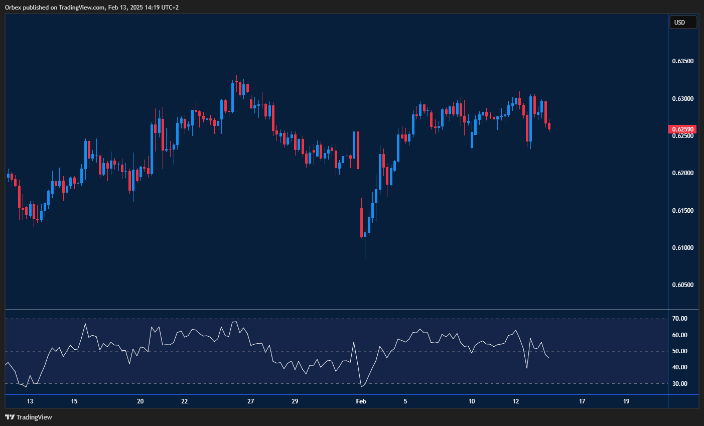 قد يدفع المشترون بالزخم إلى الأمام إذا تمكن الزوج من الإغلاق فوق 0.6300، مما يعزز النظرة الإيجابية. ومع عودة مؤشر القوة النسبية (RSI) إلى المنطقة المحايدة، فإن مستوى 0.6230 يشكل دعمًا جديدًا، حيث يدخل السعر في مرحلة تماسك سعري.