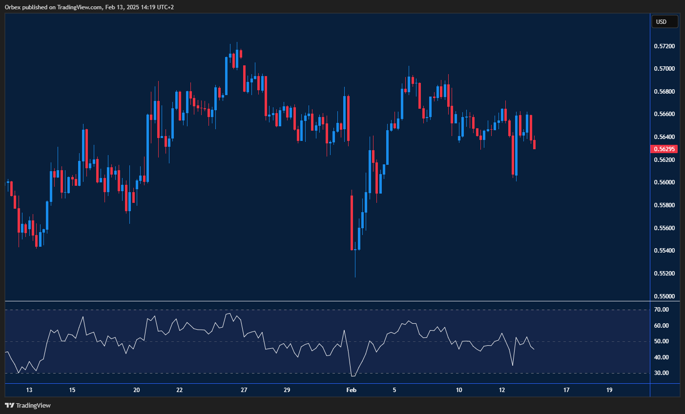 في حال كسر هذا المستوى، قد نشهد تراجعًا نحو القاع الأخير عند 0.5520. وعلى الجانب الآخر، فإن اختراق القمة الأخيرة عند 0.5700 قد يؤدي إلى موجة ارتفاع قوية. ومع ذلك، يظل المشترون حذرين، حيث إن مؤشر القوة النسبية (RSI) لا يزال يبحث عن اتجاه واضح، مما يزيد من احتمالات حدوث تراجع آخر.
