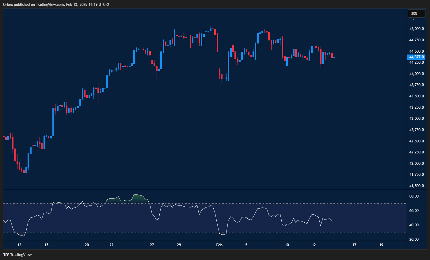 واصل مؤشر داو جونز الصناعي تحقيق قمم جديدة مدعومًا ببيانات إيجابية من موسم الأرباح. لا يزال المؤشر فوق مستوى 44000، مما يوفر نطاق حركة واسعًا، حيث يتنافس المشترون والبائعون على السيطرة.