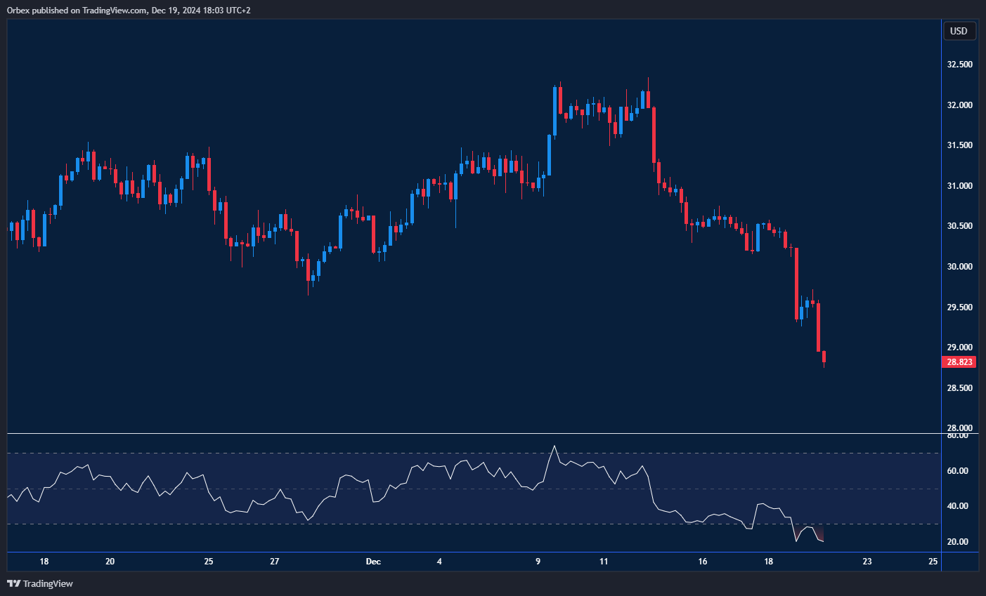 شهدت أسعار الفضة، كما سوق المعادن، تراجعًا حادًا بسبب اللهجة المتشددة الصادرة عن الفيدرالي. حاليًا، يختبر السعر منطقة الأسعار التي تم تسجيلها في سبتمبر الماضي دون مستوى 29.00. ومع دخول مؤشر القوة النسبية على المدى اليومي والساعة إلى منطقة ذروة البيع، قد تتعرض الفضة لضغوط قوية من المشترين الذين يسعون لوقف التراجع، وكذلك من البائعين الذين يرغبون في جني بعض الأرباح. سيجبر الاختراق الإيجابي البائعين على تغطية مراكزهم، مما يؤدي إلى ارتفاع السعر نحو مستوى 30.00. أما في حال استمرار الانخفاض، فإن الدعم الجديد سيكون عند المستوى 28.40.
