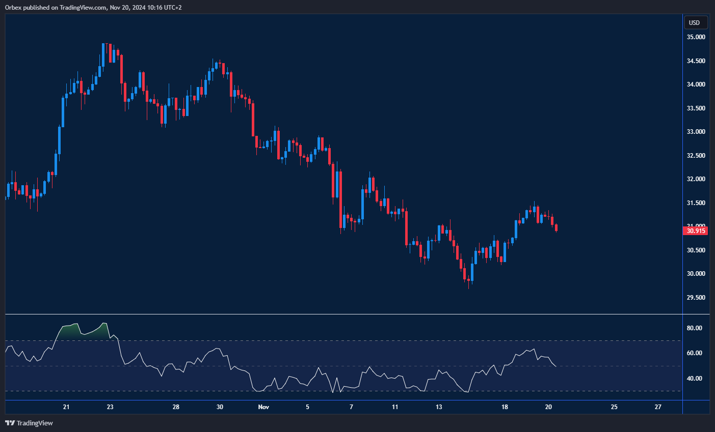 شهدت الفضة انتعاشًا ملحوظًا مع صعود المعادن وعودة الزخم إلى سوقها، حيث ارتدت الأسعار من القاع الأخير عند 30.00. ومع ذلك، توقفت الحركة الصعودية عند المقاومة اليومية 31.50. مما يشير إلى أن السوق يحتاج إلى فترة من التماسك لالتقاط الأنفاس. اختراق مستوى 31.50 قد يجدد الزخم الشرائي، مع استهداف مستوى 32.80 كحاجز رئيسي يمنع التصحيح. في حال تجاوز هذا الحاجز، يمكن أن تستعيد الفضة مسارها الصعودي وتواصل الارتفاع نحو ذروة أكتوبر فوق مستوى 34.50.