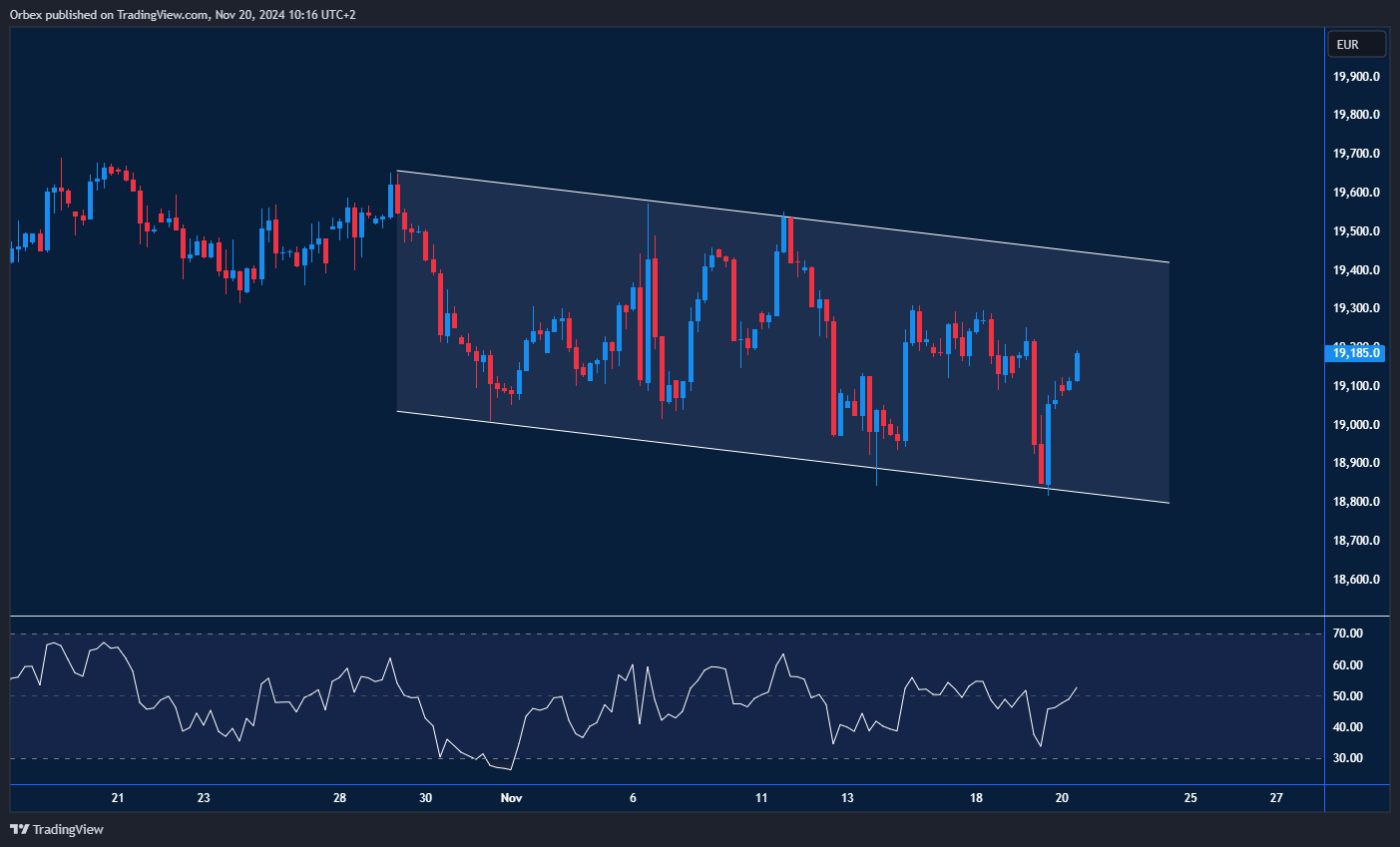 يحاول مؤشر داكس الألماني الخروج من النطاق الهابط بعد الابتعاد عن منطقة الدعم عند 18800. في الوقت الحالي، يتحرك المؤشر فوق مستوى 19000. والذي يُعد نقطة دعم محورية للحفاظ على استقرار الحركة السعرية ومنع موجة بيع أوسع. دخول مؤشر القوة النسبية إلى المنطقة المحايدة قد يشجع المستثمرين على شراء الانخفاضات، متطلعين إلى ارتداد صعودي. على الجانب العلوي، يمثل مستوى 19500، الواقع عند قمة القناة الهابطة، العقبة الأولى التي يجب تجاوزها لتحسين النظرة الفنية على المدى القصير وإعادة السوق إلى حالة من التفاؤل.