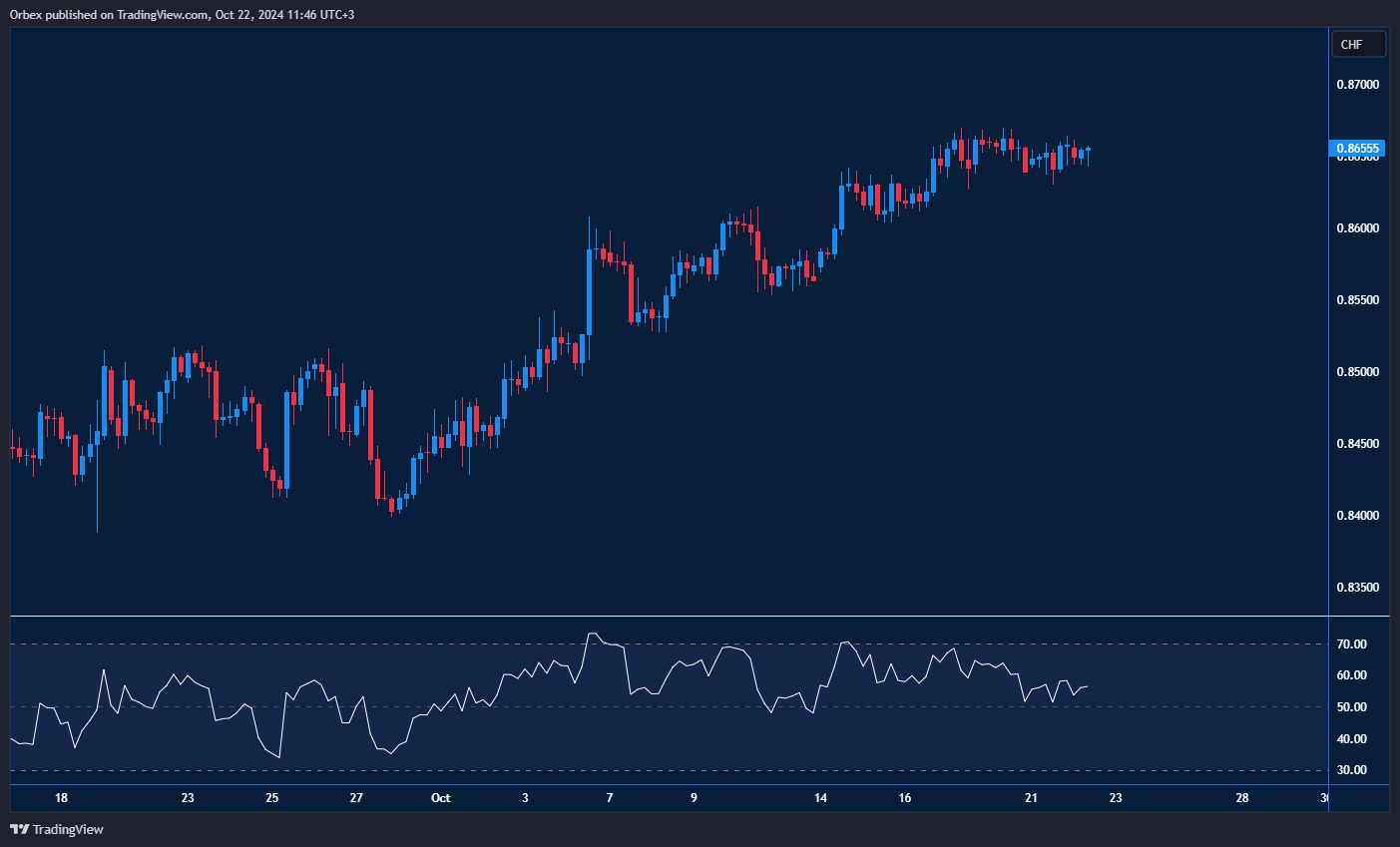تراجع الدولار الأمريكي بعد انتهاء موجة الارتفاع التي شهدها في شهر أكتوبر، والتي أضاف خلالها أكثر من 200 نقطة إلى قيمته مقابل الفرنك السويسري. بلوغ سعر الصرف أعلى مستوى له خلال الشهر عند 0.8670، يدل عل انعكاس وشيك للاتجاه. لا سيما إذا ما أقرناه بتوغل مؤشر القوة النسبية المتكرر في منطقة ذروة الشراء في هذا الوقت، والذي يدل على الزيادة المفرطة في الاسعار، مما ينبئ بتراجع محتمل لزخم الارتفاع. ولا يُستبعد حدوث ذلك إذا ما بدأ المشترين في جني الأرباح. في ذلك الوقت، سيكون المستوى 0.8600 بمثابة أول منطقة دعم لتقييم مدى الرغبة في مواصلة الاتجاه بعد الانخفاض.