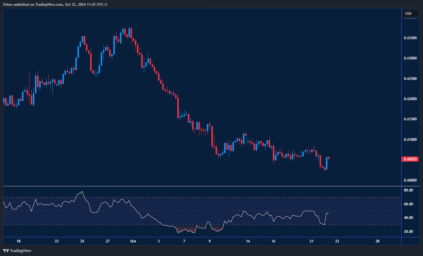 يسعى الدولار النيوزيلندي لوقف موجة الهبوط التي تعرض لها بعد تراجعه من أعلى مستوياته المسجلة في يوليو. ويبدو أنه قد وجد دعمًا بالقرب من المستوى 0.6050، رغم الأجواء الحذرة السائدة. يشير الاختراق المؤقت لمستوى 0.6130 بعد بدء الانخفاض المحدود إلى إمكانية تحول إيجابي في الاتجاه، وقد يعزز اختراق قوي لهذا المستوى من الزخم ويدفع السعر للارتفاع. ولكن في حال استمرار التراجع، سيكون مستوى الدعم الأول عند 0.6000.