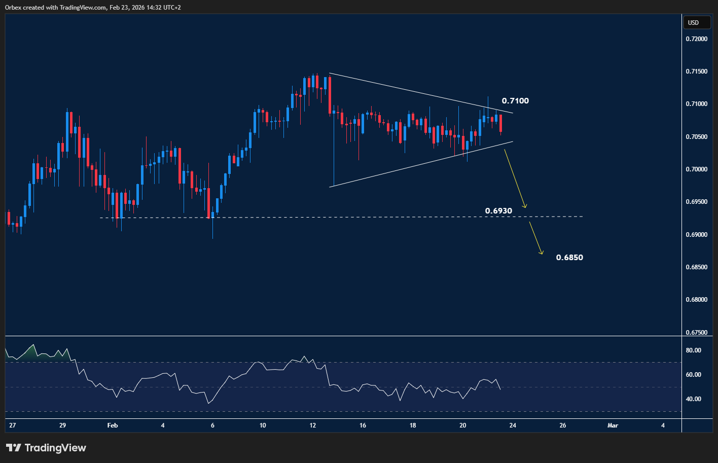 يُظهر الدولار الأسترالي مرونة واضحة في الحفاظ على مكتسباته، وهو ما أبقى تداولات الزوج ضمن مناطق سعرية مرتفعة، تزامناً مع انحصار التحركات الفنية داخل نطاق نموذج “المثلث المتماثل”. وقد نجح الزوج في امتصاص جزء من التراجعات الناتجة عن ضغوط البيع الشهرية عقب ارتداده من ذروة 0.7150، مما يرجح استمرار المسار العرضي في المدى المنظور؛ ومع ذلك، قد يتجه “مشتري الزخم” لتعزيز مراكزهم الشرائية في حال تحقق إغلاق سعري مؤكد فوق حاجز 0.7100. ومع انسحاب مؤشر القوة النسبية نحو المستويات الحيادية، تبرز منطقة 0.6930 كدعم فني مستحدث، بينما يظل مستوى 0.6850 هدفاً هبوطياً يلوح في الأفق.
