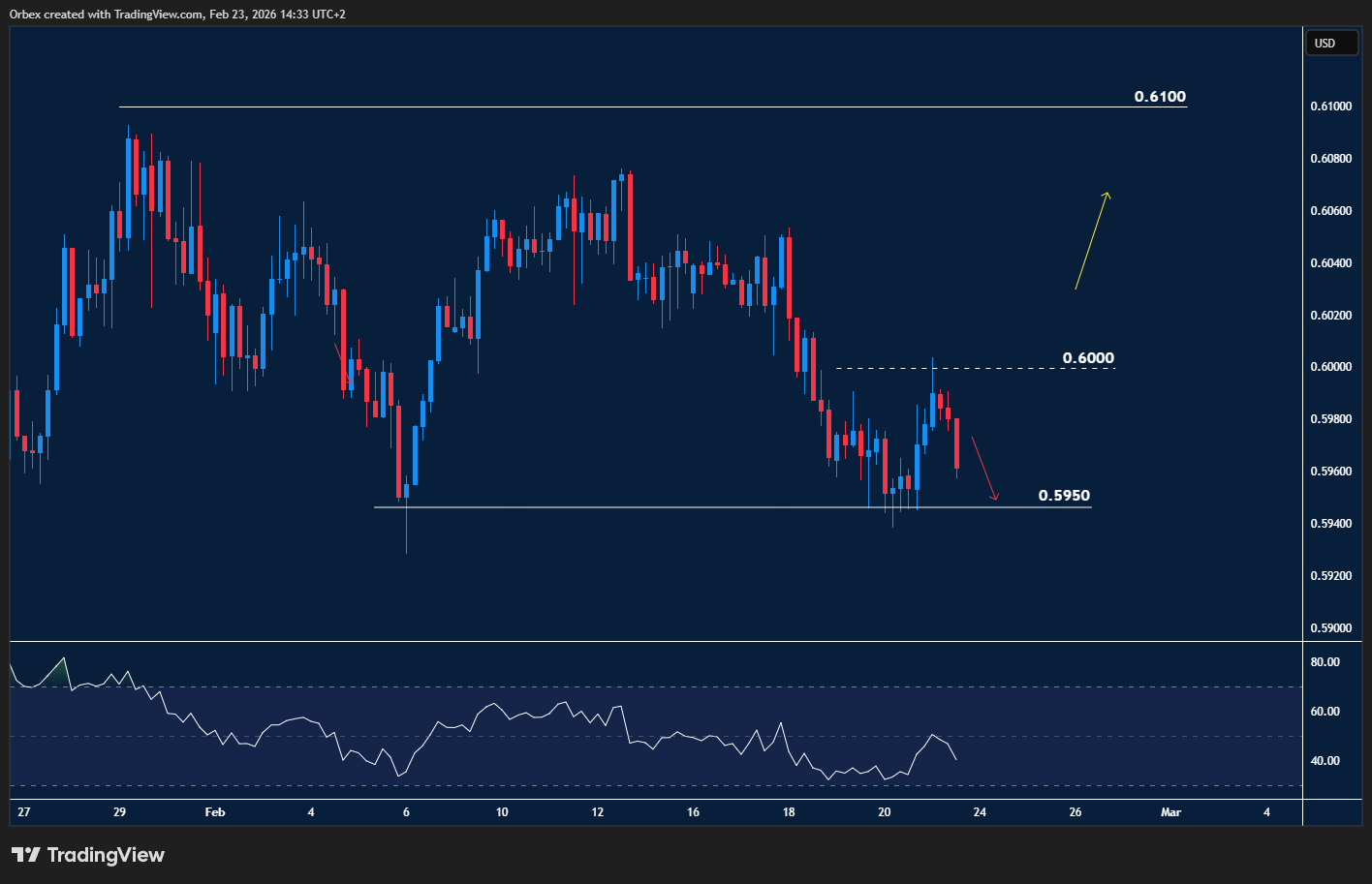 سلك الدولار النيوزيلندي مساراً تراجعياً متواصلاً في ظل انكماش شهية المخاطرة السائدة في الأسواق العالمية. ويعكس التشكّل الفني لـ “القناة الهابطة” على الرسم البياني تزايد حدة الضغوط البيعية. حيث يضع “الدببة” مستوى 0.5950 كهدف استراتيجي تالٍ. إذ إن كسر هذا الحصن قد ينكشف معه القاع الأخير المسجل عند 0.5900. وفي المقابل، فإن أي اختراق ناجح للقمة الأخيرة عند 0.6000 قد يمثل نقطة انطلاق لرالي صعودي قوي. خاصةً وأن استمرار انخفاض مؤشر القوة النسبية يعزز من قناعة المشترين باقتراب لحظة التحول الصعودي المحتملة.