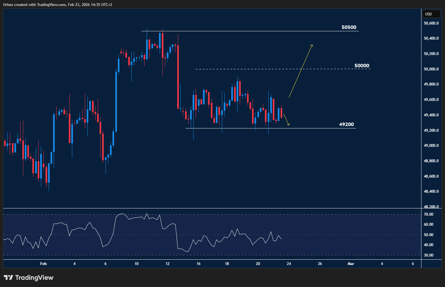 سجل مؤشر “داو جونز” قاعاً سعرياً جديداً بالتزامن مع الشروع الفعلي في تنفيذ السياسات الرئاسية المتعلقة بفتح جبهات تجارية جديدة. ورغم هذه الضغوط، يحافظ المؤشر على ثباته فوق مستوى 49000. هذا ما يتيح هامشاً واسعاً من التذبذب في ظل صراع محتدم لفرض السيطرة بين “المراهنين على الصعود” و”المراهنين على الهبوط”. ويبرز مستوى 49200 كركيزة دعم فنية جديدة، حيث إن تجدد الزخم الشرائي من هذه المستويات سيمهد الطريق لاختبار حاجز 50000 لتشكيل قمة قياسية غير مسبوقة. في حين تظل المخاطر البيعية قائمة طالما استمرت التحركات تحت وطأة الاتجاه الهابط.