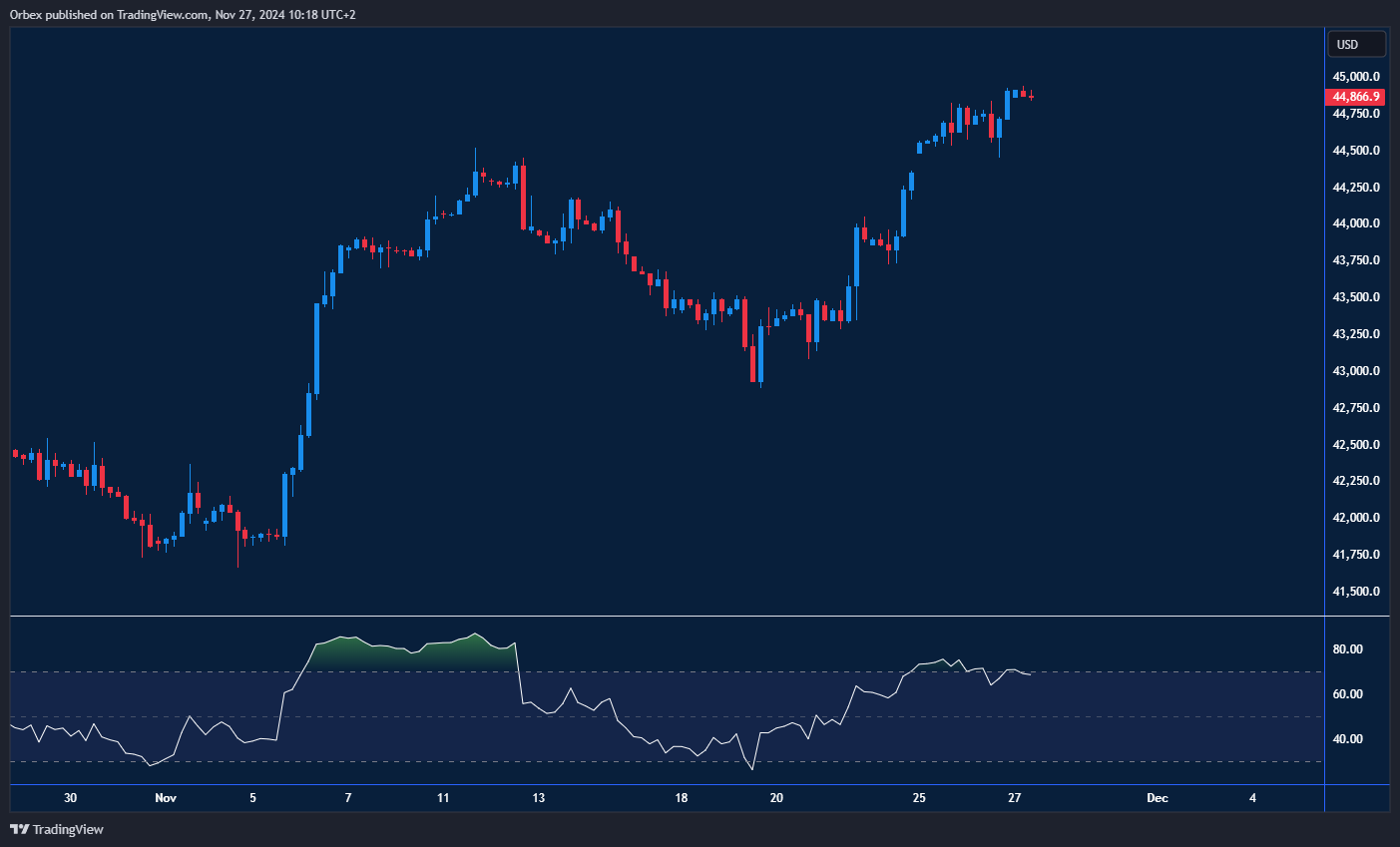 ارتفع مؤشر داو جونز 30 إلى قمة قياسية جديدة مع تزايد التفاؤل بشأن إمكانية تحقيق الاقتصاد الأمريكي هبوطاً سلساً. اختراق المؤشر لقمة الشهر السابق عند مستوى 44000، مكنه من تعويض جميع الخسائر التي تكبدها نتيجة عمليات البيع التي شهدها في منتصف نوفمبر، هذا التطور ساعد المشترين على استعادة الثقة وجذب المستثمرين المترددين الذين كانوا خارج السوق. يعتبر مستوى 45000 الهدف التالي، واختراقه قد يفتح المجال لاستمرار موجة الصعود. وفي حالة احتياج السوق إلى حركة تصحيح، فإن مستوى 44600 يمثل الدعم المباشر.