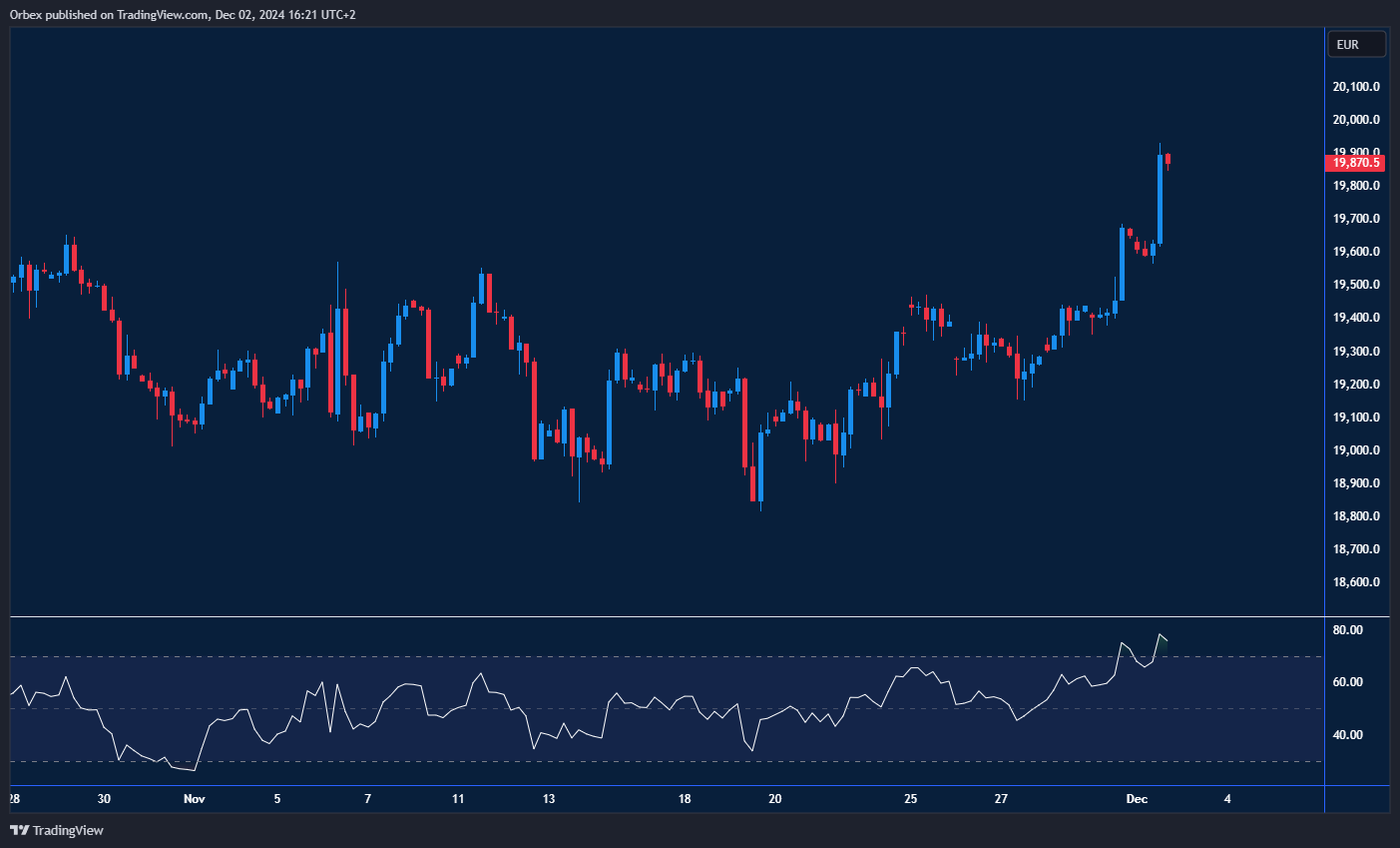 سجل مؤشر داكس 40 ارتفاعًا إضافيًا، مدعومًا بتفاؤل الأسواق العالمية وارتفاع مؤشرات الأسواق الأمريكية. وبعد أن واجه مقاومة عند مستوى 19700، استطاع المؤشر تحقيق مكاسب إضافية بلغت 200 نقطة، ليحقق بذلك مستوى قياسي جديد. أي ارتفاع آخر قد يدفع المزيد من البائعين لإغلاق مراكزهم، مما يتيح المجال لاختبار الهدف التالي عند مستوى 20000. هذا الأمر سيعزز من احتمالات استمرار الاتجاه الصاعد. يُعتبر مستوى 19600 هو الدعم الأول لتقييم قوة متابعة عمليان الشراء.