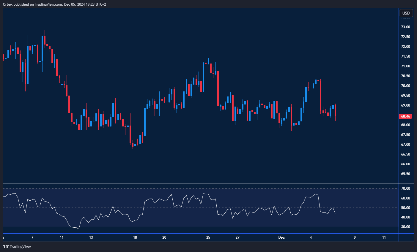 شهدت أسعار النفط انخفاضًا بعد عدم قدرتها على الاستفادة من الارتفاع الأخير الذي تجاوز مستوى 70.00. قد يوفر مستوى 68.00 القريب من قاعدة الاختراق الإيجابي، بعض الدعم للمشترين، لا سيما مع تعافي مؤشر القوة النسبية ودخوله المنطقة المحايدة. يُعتبر مستوى 68.80 العقبة الأولى التي يجب تجاوزها لتقليص الضغط السلبي. إذا استمر الاتجاه الصاعد، يمكن توقع مقاومة قوية بالقرب من المستوى 71.50. ومع ذلك، فإن اختراق مستوى 70.00 هو ما قد يجبر البائعين على الانسحاب، مما يؤدي إلى انتعاش مستدام.