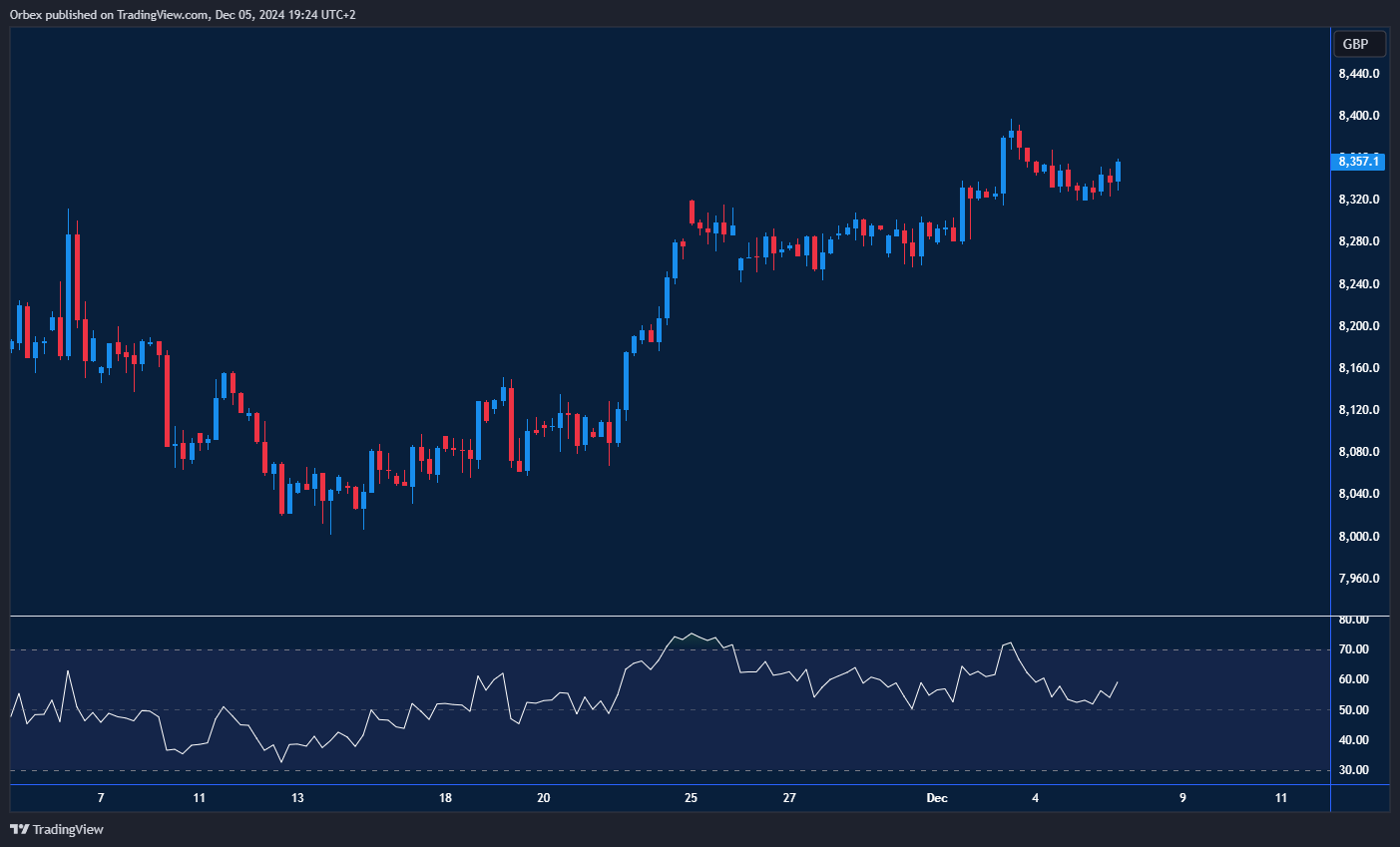 يواصل مؤشر فايننشال 100 (فوتسي) ارتفاعه قبل صدور بيانات الناتج الإجمالي المحلي. شهد الارتداد نحو القمة الأخيرة عند 8370 ضغط بيع قوي، تزامن مع خروج المشترين الذين كانوا محاصرين سابقًا من السوق بأقل خسائر ممكنة. يُعتبر مستوى 8320 هو الدعم الأحدث للحفاظ على الزخم الحالي، وكسره قد يعرض القاع الرباعي عند 8240 للخطر. ومع ذلك، إذا استطاع المشترون تجاوز مستوى 8400، فقد يؤدي ذلك إلى موجة صعود ممتدة تدفع المؤشر نحو قمم جديدة.