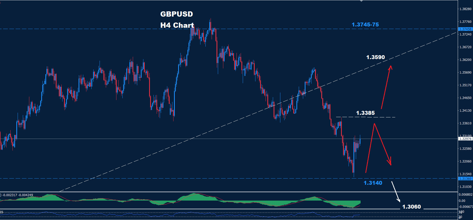 كما نرى على الرسم البياني، يواجه السوق دعمًا عند 1.3140، بينما يواجه مقاومة عند 1.3385، مما قد يُشكل منطقة تداول.