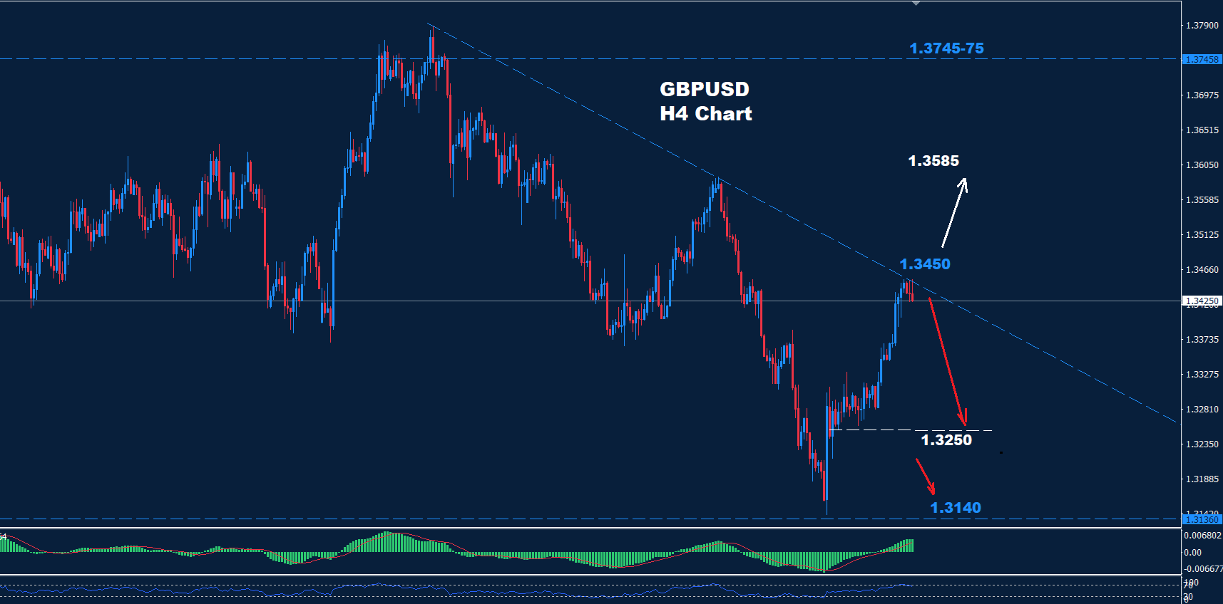 في حال اختراق مستوى 1.3475، قد يتجه الزوج لمواصلة الصعود، مع وجود مستويات مقاومة تالية عند 1.3585 ثم 1.3745.