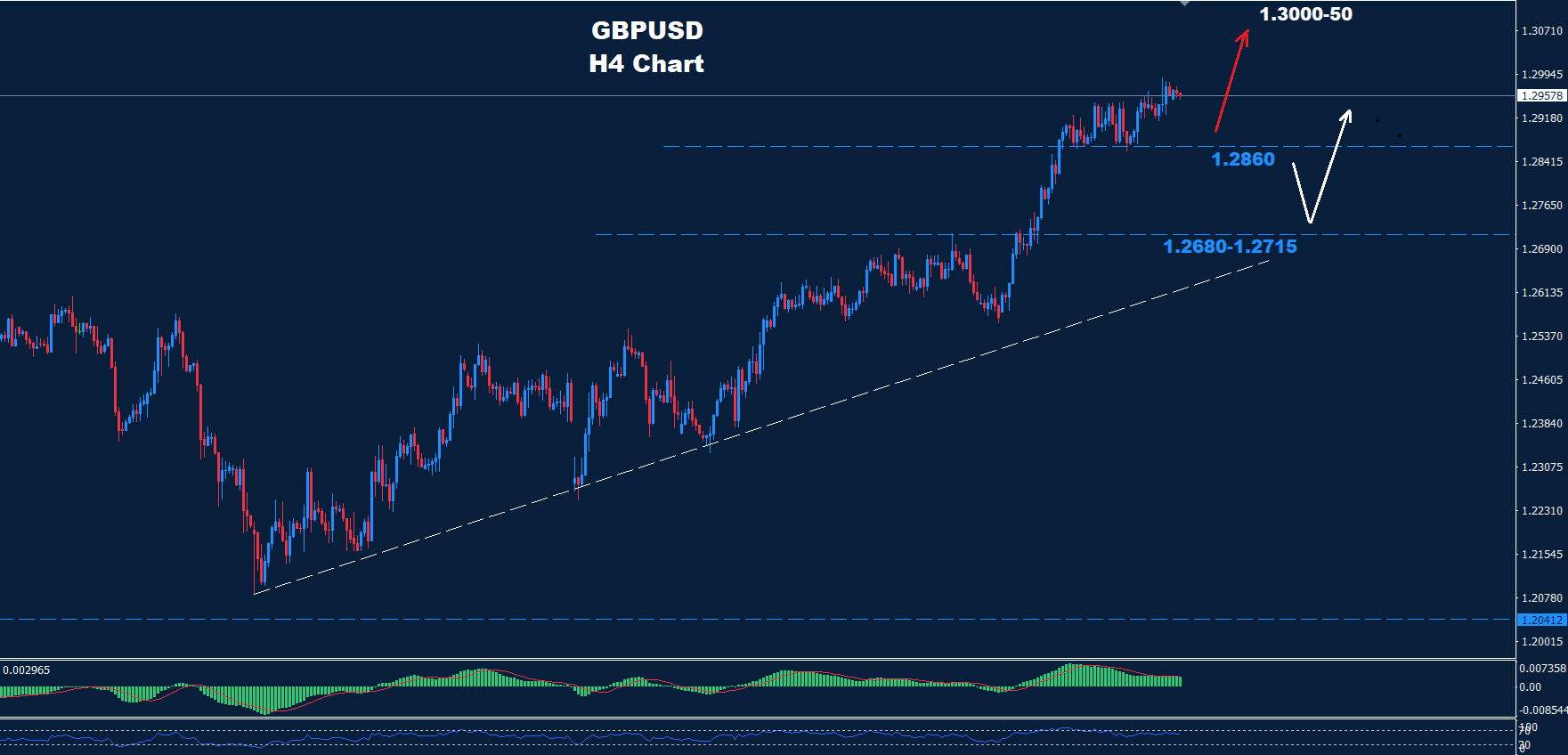 تحت مستويات 1.2860 قد تضرب السوق مزيد من التراجع لإعادة اختبار منطقة الدعم 1.2680-1.2715 قبل عودة موجة التقدم للسيطرة على السوق.