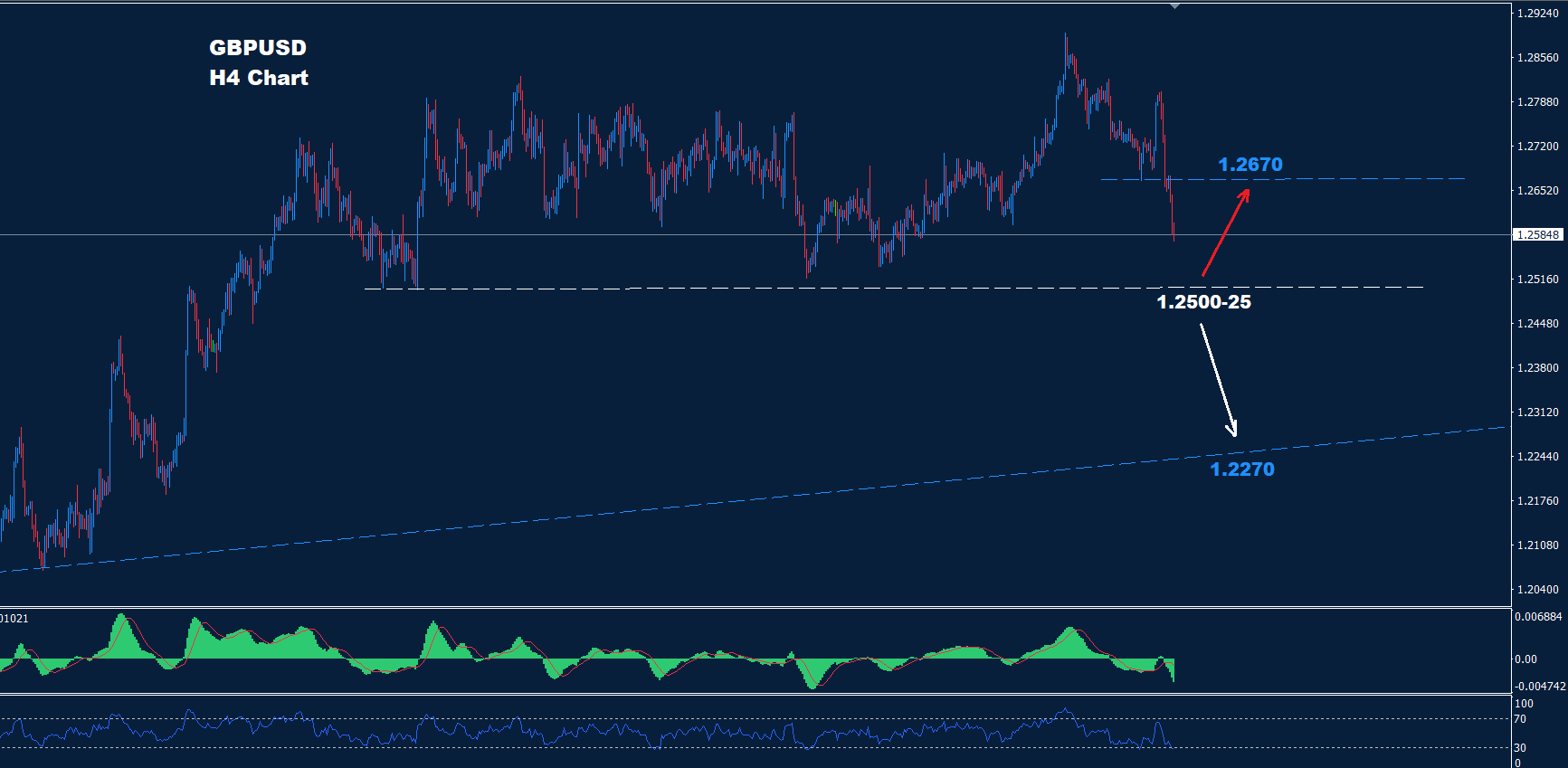تمكن الجنيه الإسترليني مقابل الدولار الأميركي من الانخفاض إلى ما دون 1.2670 مما قد يدفع لمزيد من الانخفاض لاختبار الدعم 25-1.2500 كما نصحنا من قبل.