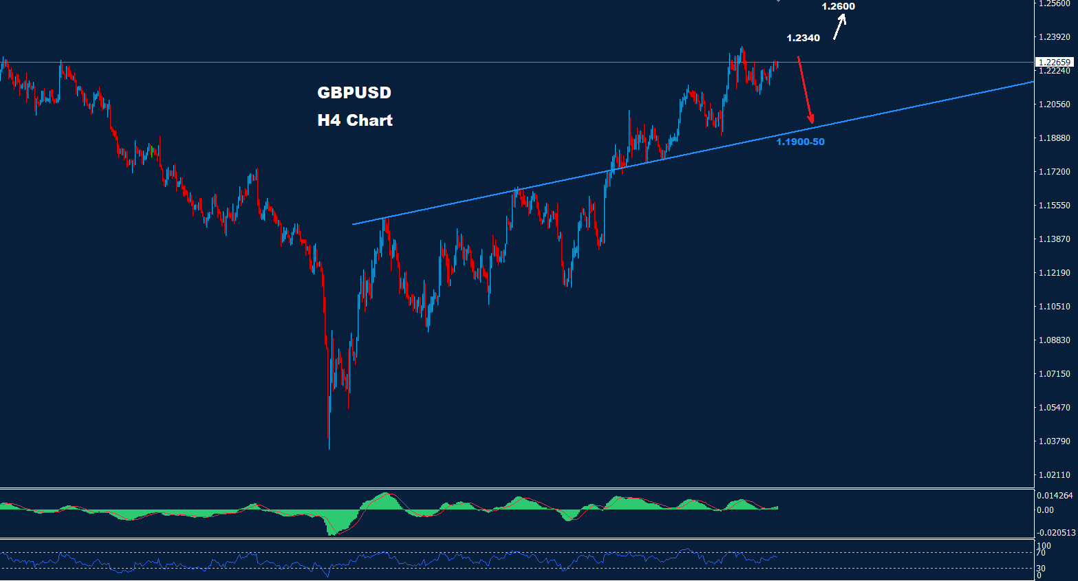 فوق 1.2340، قد تضرب فرصة تقدم أبعد السوق حيث توجد المقاومة عند 1.2400 و 1.2660.