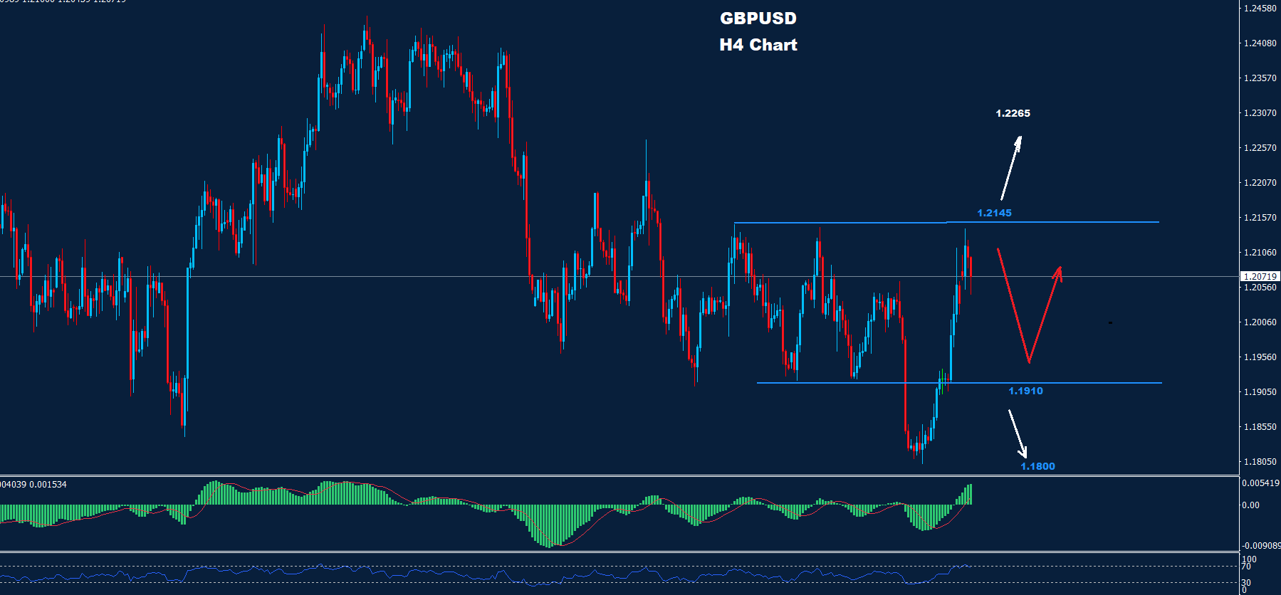 كما نرى على الرسم البياني، وطالما أن السوق يحتفظ بالتداولات دون 1.2145، فإن فرصة التصحيح الهبوطي داخل منطقة التداول نحو 1.1910 قد تسيطر على السوق.