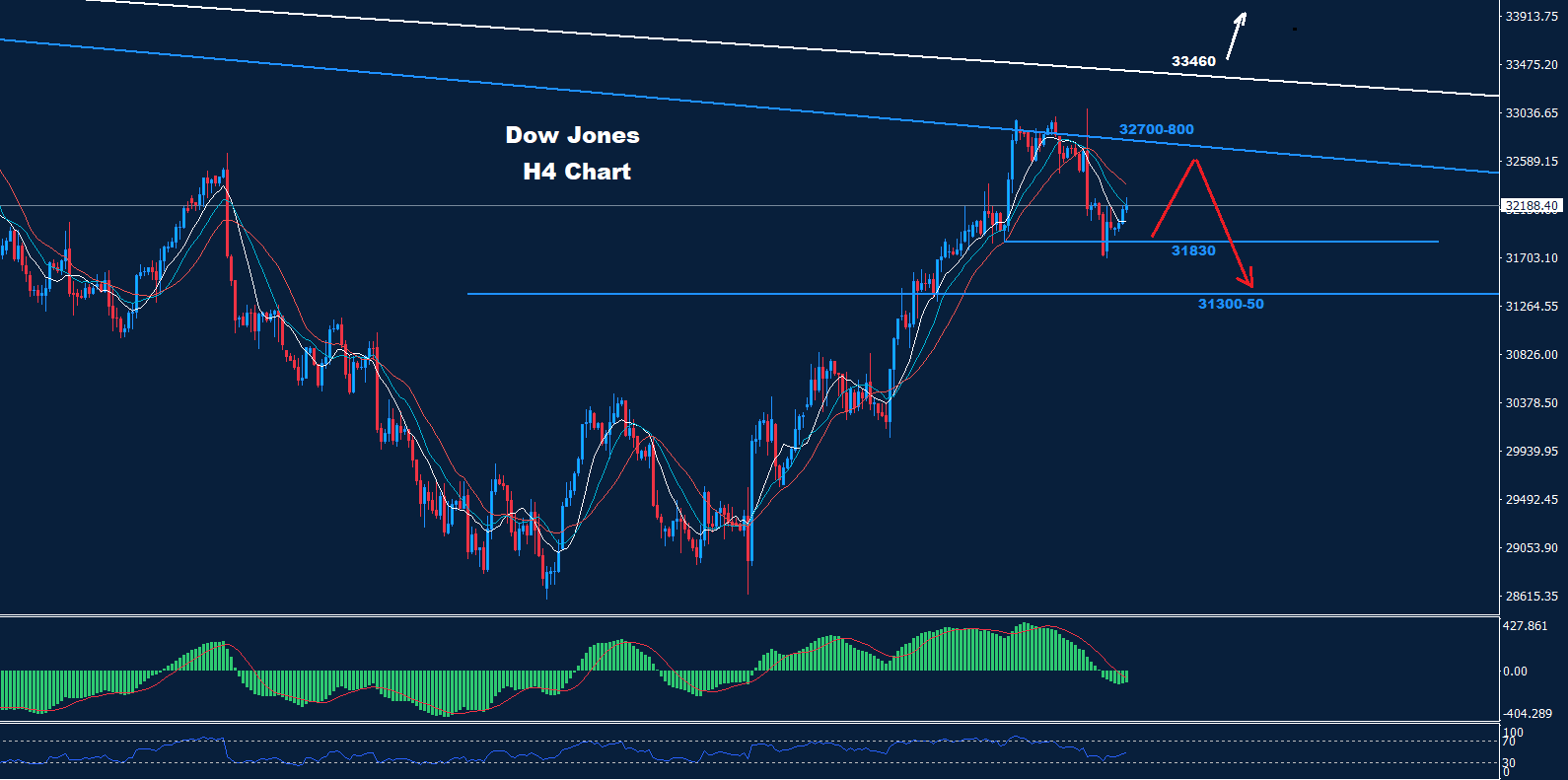 يواجه مؤشر داو جونز الآن فرصة لتصحيح ارتداد نحو 32800 قبل أن تضرب موجة هبوط أخرى السوق باتجاه منطقة 31300