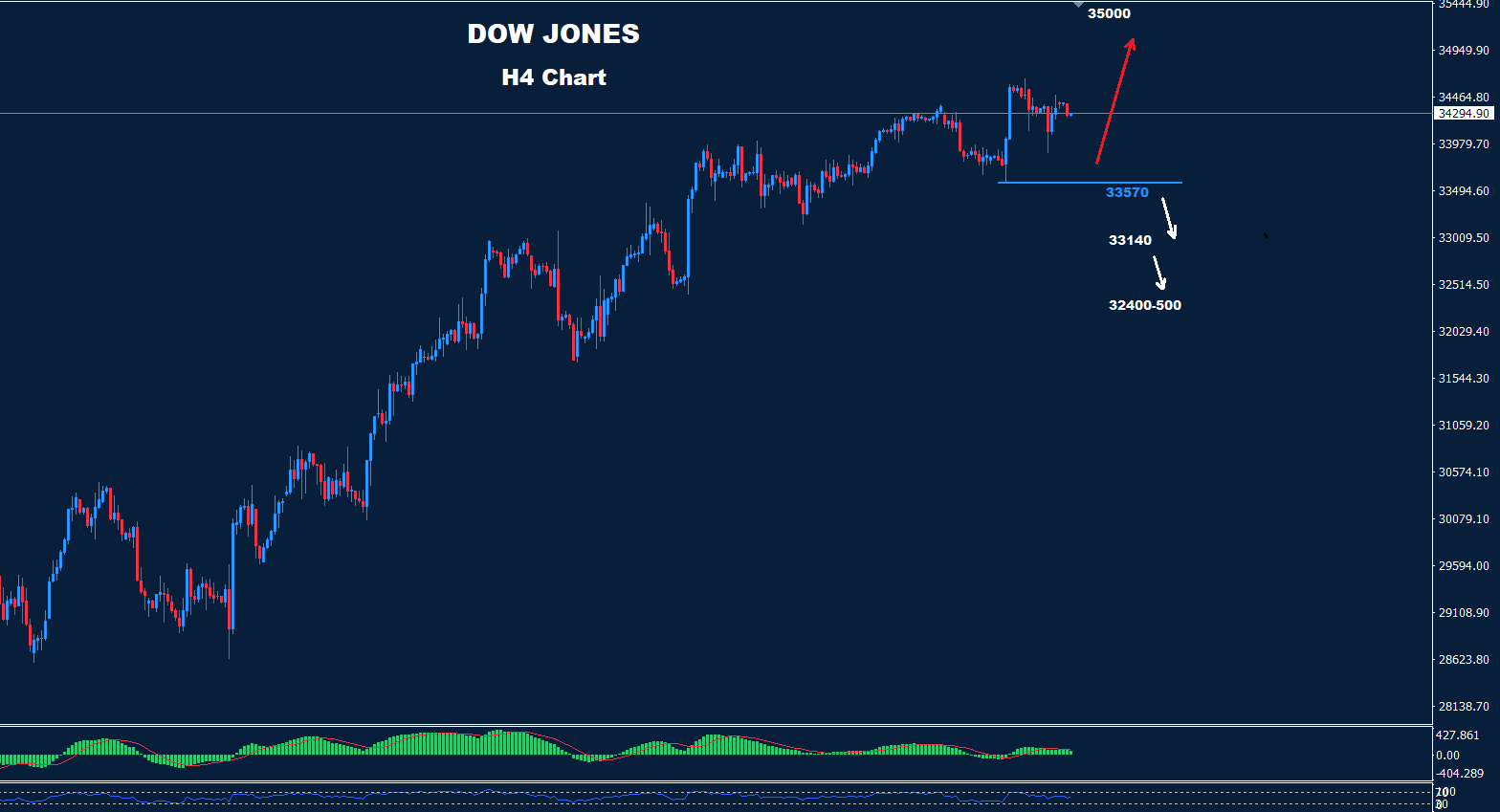 تمكن مؤشر الداو من الاحتفاظ بالتداولات فوق الدعم الثاني 33570 حيث لا يزال السوق داخل الموجة الصاعدة نحو 35000 كما أشرنا الأسبوع الماضي.