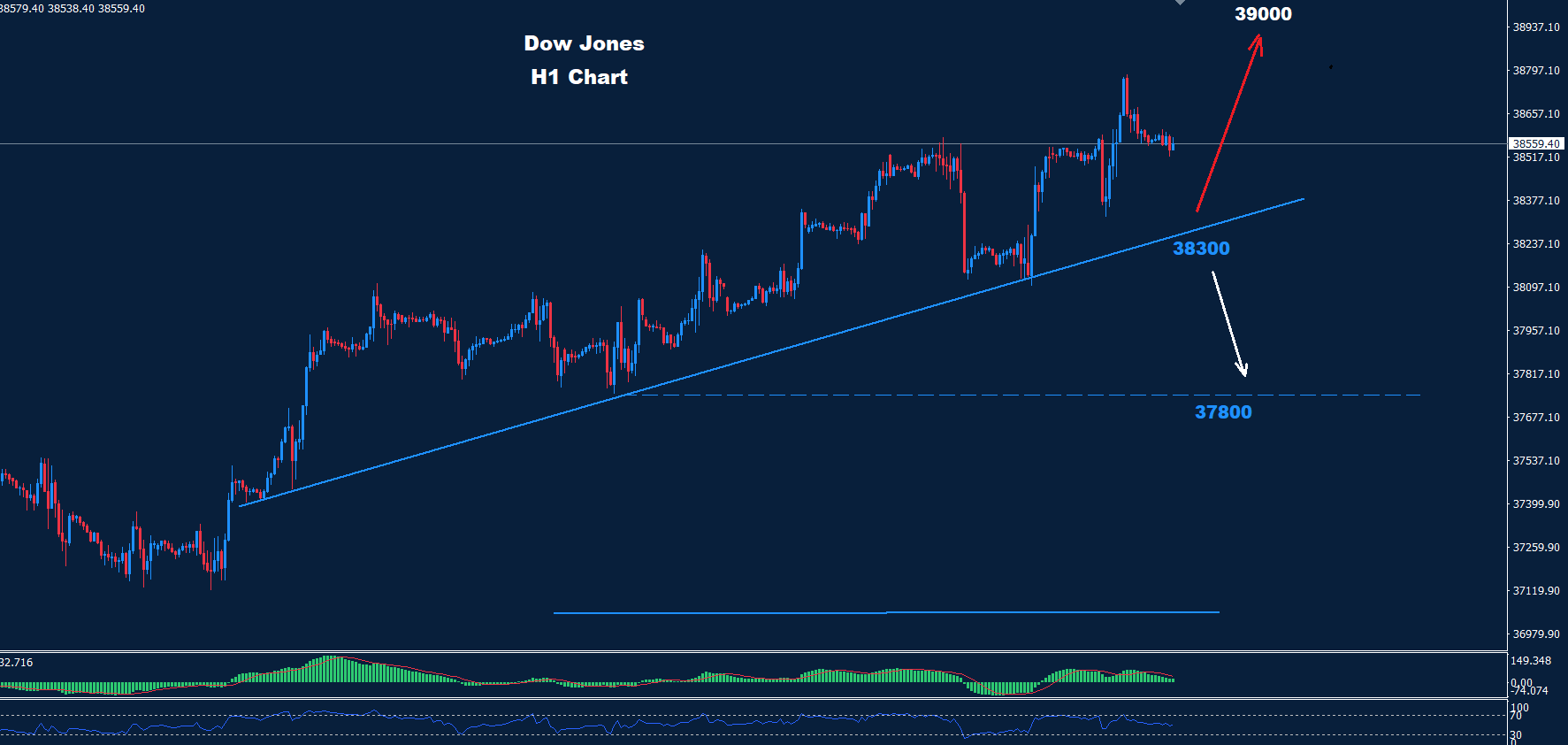 تمكن مؤشر داو جونز من تسجيل أدنى مستوى عند 38212 منذ يومين بينما عاد السوق مرة أخرى فوق 38300 مما يبقي توقعاتنا المتقدمة مستمرة بينما يتم تعديل منطقة الدعم لتكون حوالي 300-38200.