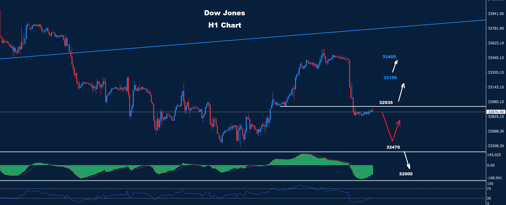 فوق 32935 فإن المزيد من التقدم قد يضرب السوق، حيث توجد المقاومة عند 33190 و33400.