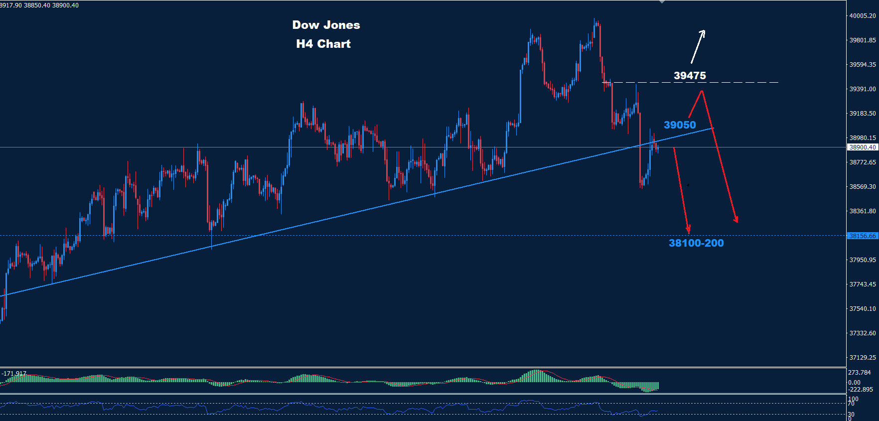 تمكن مؤشر داو جونز من الانخفاض إلى ما دون مستوى الدعم 38800 الأسبوع الماضي مما قد يدفع لمزيد من الحركة الهبوطية كما نصحنا من قبل