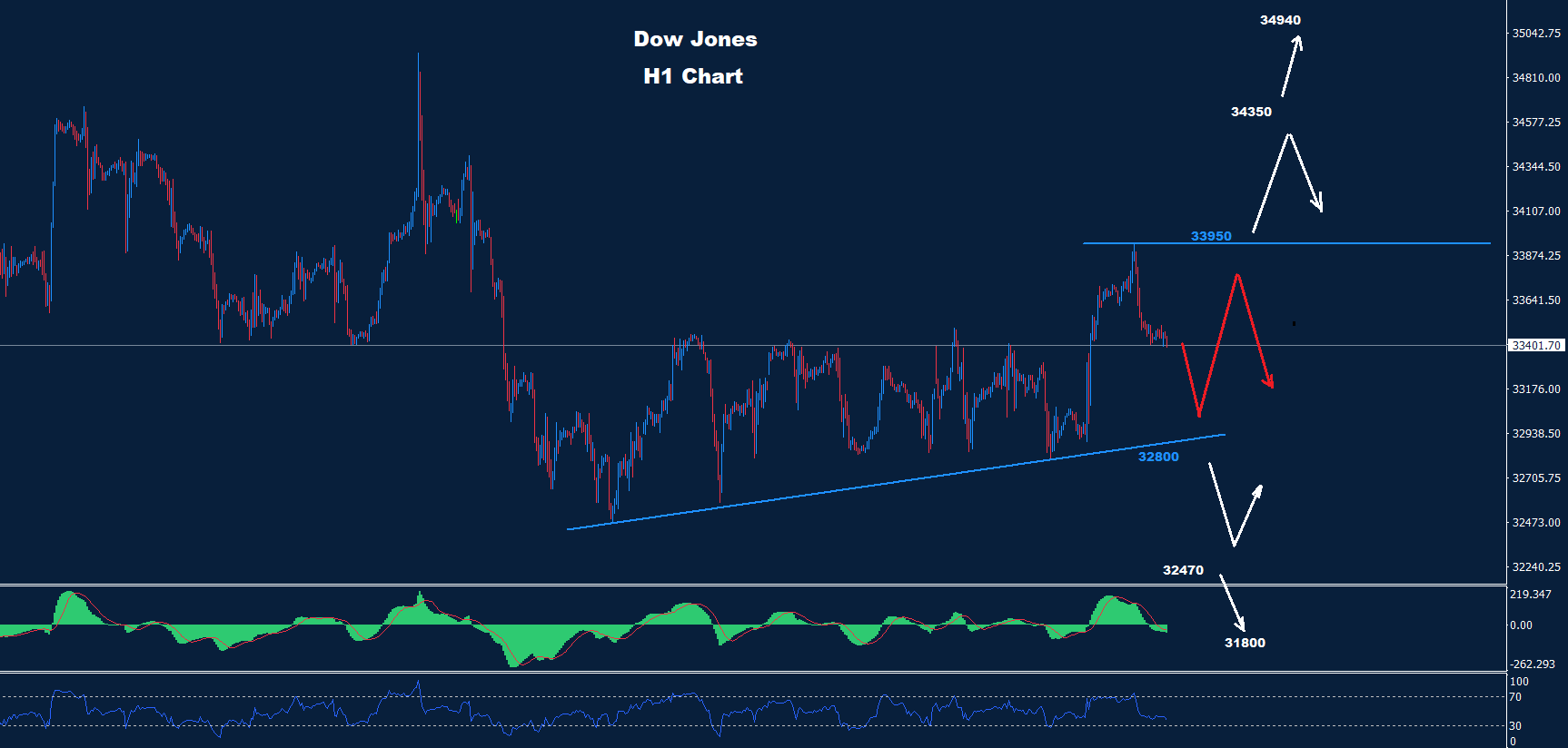 لا يزال مؤشر الداو جونز يعطي إشارات لاستمرار منطقة التداول بين الدعم 32800 والمقاومة 33950.