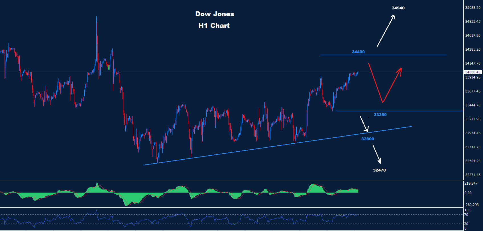 فوق 34400، قد تضرب فرصة للتقدم أبعد السوق حيث توجد مقاومة أخرى عند منطقة 34950.
