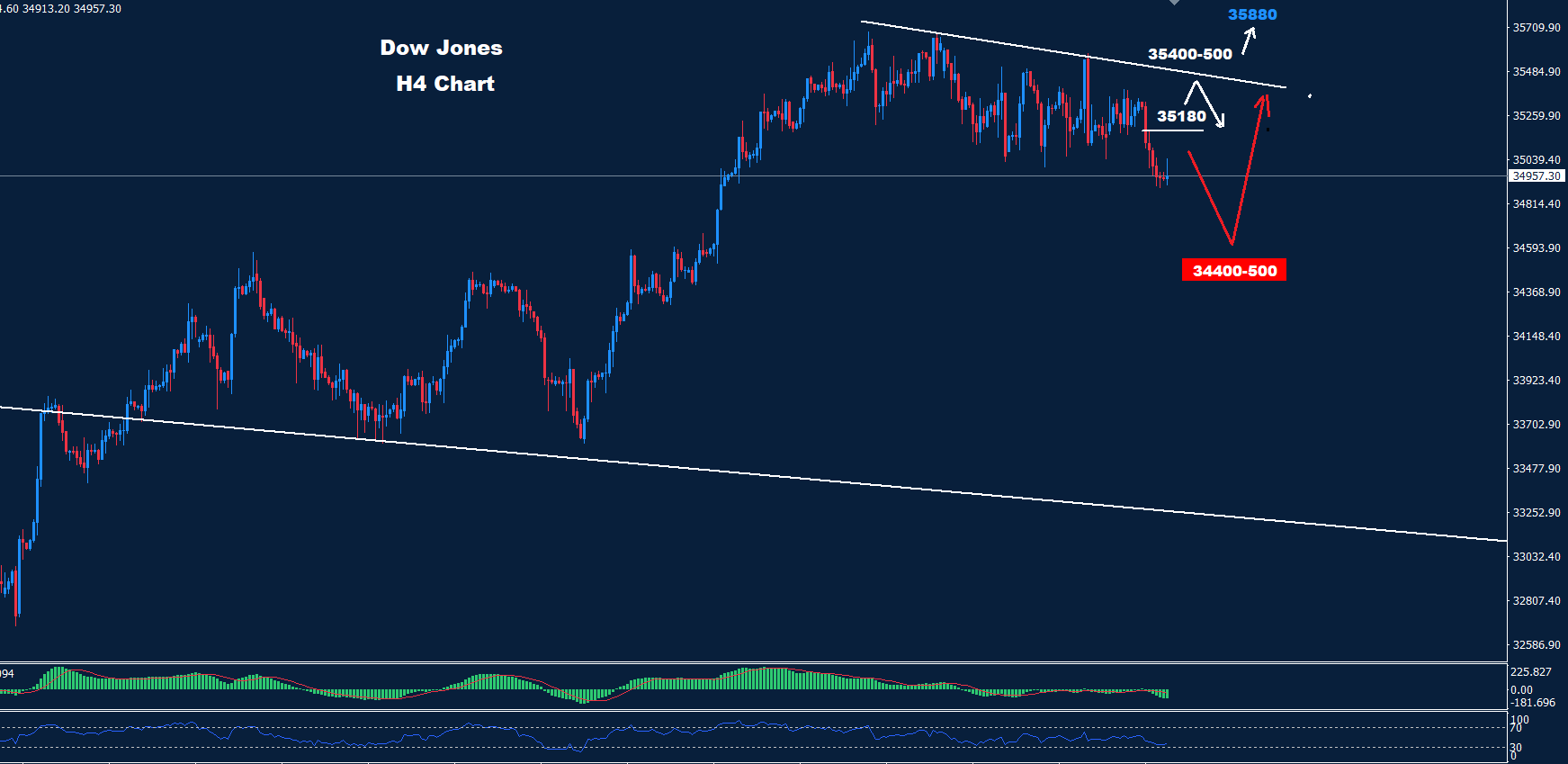 كما نرى على الرسم البياني وطالما استمر السوق في الاحتفاظ بالصفقات دون 35180 ، فقد يستمر ضغط الاتجاه الهبوطي لاختبار منطقة دعم المدى القصير 600-34500 والتي قد تدفع نحو موجة متقدمة أخرى