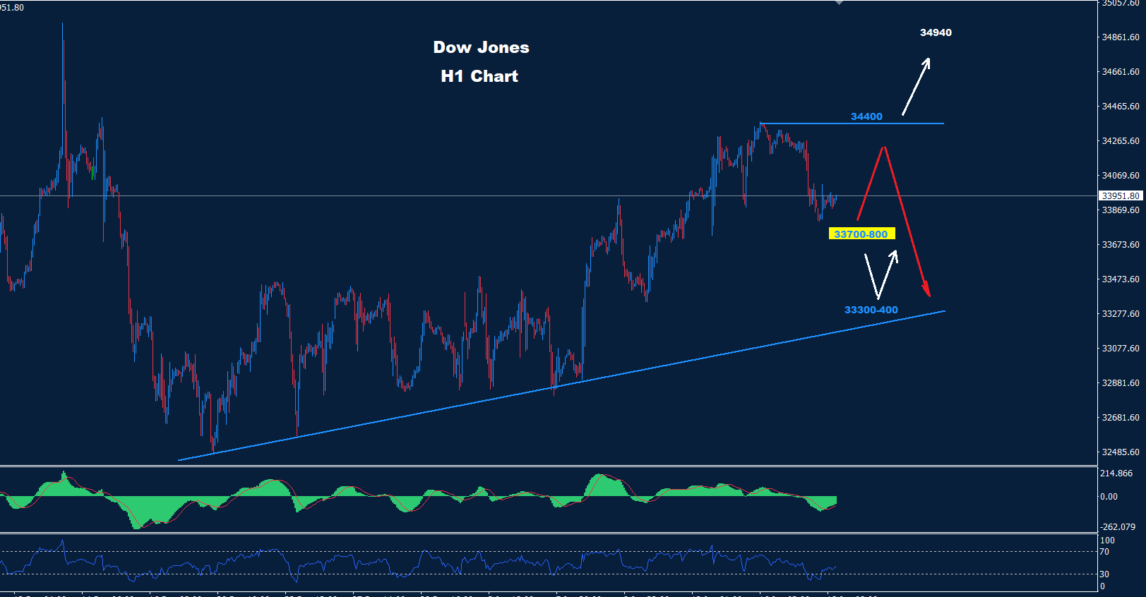 تمكن مؤشر الداو من الاحتفاظ بالتداولات تحت 34400 حيث تمكن من التوجه لبعض التراجع التصحيحي نحو منطقة الدعم الأولى 800-33700 كما نصحنا الأسبوع الماضي.