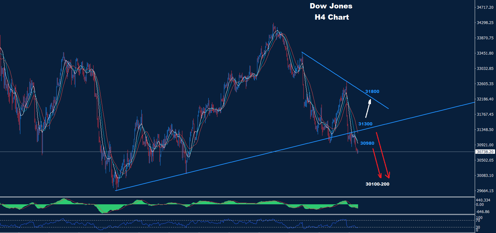 تمكن مؤشر الداو من الانخفاض إلى ما دون الدعم 30980 حيث نصحنا في وقت مبكر من الأسبوع الماضي أنه دون هذه المستويات ، قد يضرب المزيد من الانخفاض نحو 30200